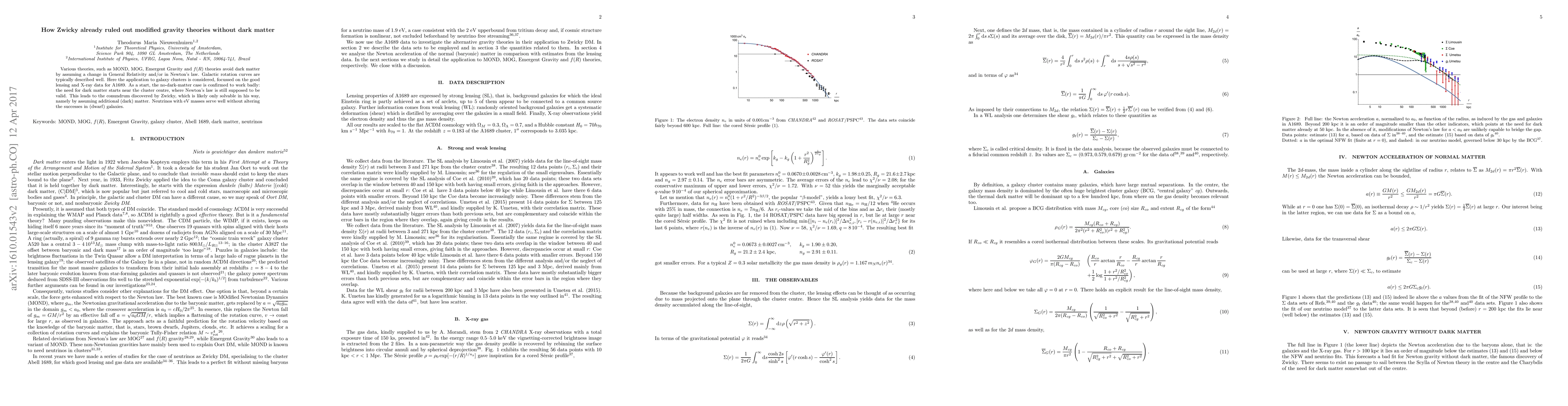 Various theories, such as MOND, MOG, Emergent Gravity and $f(R)$ theories avoid dark matter by assuming a change in General Relativity and/or in Newton's law. Galactic rotation curves are typically described well. Here the application to galaxy clusters is considered, focussed on the good lensing and X-ray data for A1689. As a start, the no-dark-matter case is confirmed to work badly: the need for dark matter starts near the cluster centre, where Newton's law is still supposed to be valid. This leads to the conundrum discovered by Zwicky, which is likely only solvable in his way, namely by assuming additional (dark) matter. Neutrinos with eV masses serve well without altering the successes in (dwarf) galaxies.