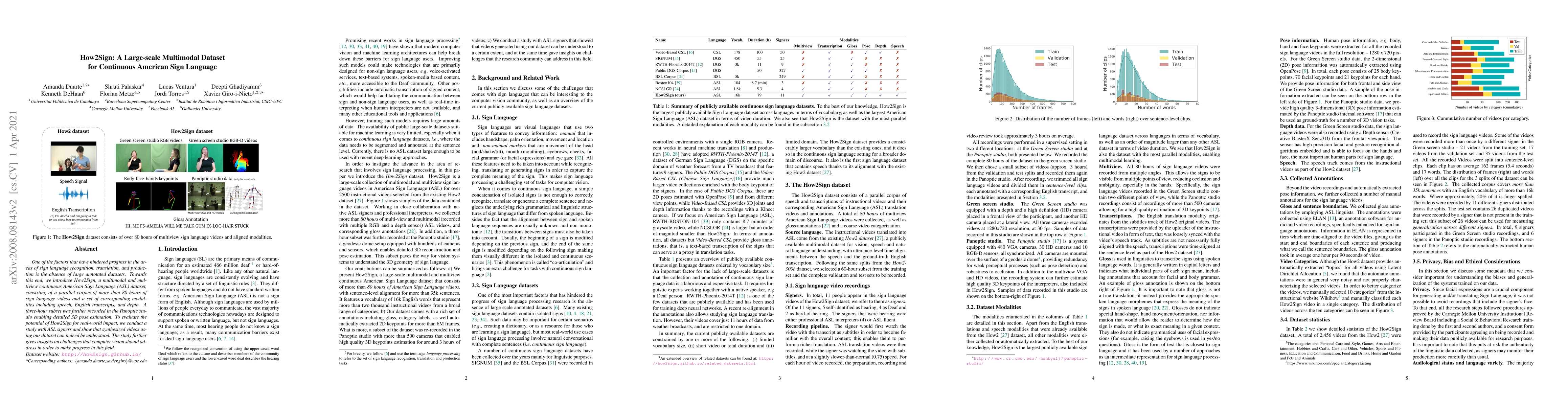 The How2Sign dataset provides a large-scale multimodal resource for continuous American Sign Language (ASL) comprising over 80 hours of sign language videos with accompanying speech, English transcripts, and depth data. Initial studies indicate that synthesized videos from the dataset are understandable, highlighting both opportunities and challenges for computer vision in sign language processing.