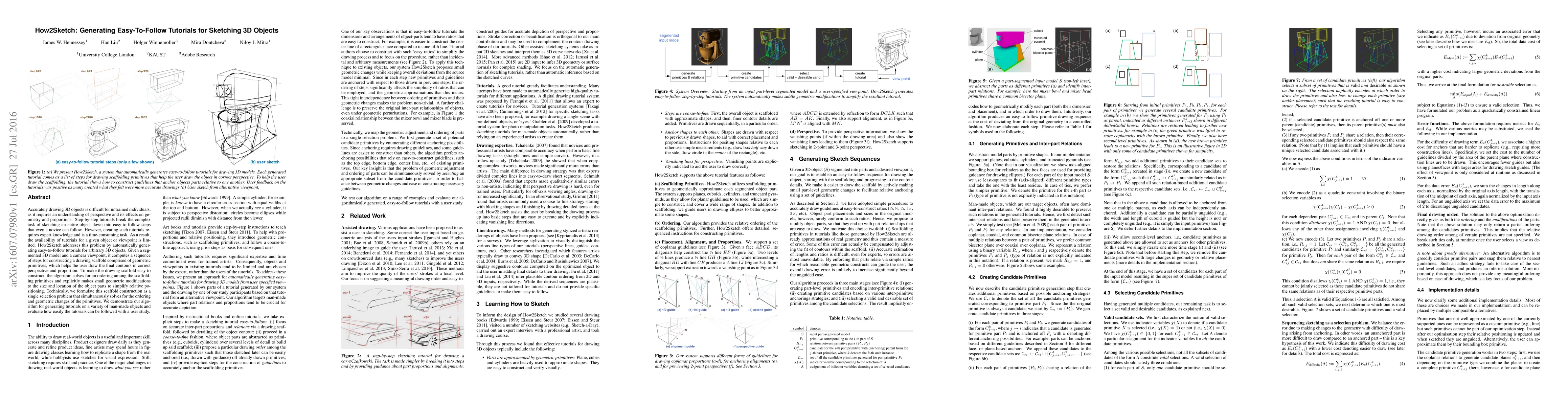 Accurately drawing 3D objects is difficult for untrained individuals, as it requires an understanding of perspective and its effects on geometry and proportions. Step-by-step tutorials break the complex task of sketching an entire object down into easy-to-follow steps that even a novice can follow. However, creating such tutorials requires expert knowledge and is a time-consuming task. As a result, the availability of tutorials for a given object or viewpoint is limited. How2Sketch addresses this problem by automatically generating easy-to-follow tutorials for arbitrary 3D objects. Given a segmented 3D model and a camera viewpoint,it computes a sequence of steps for constructing a drawing scaffold comprised of geometric primitives, which helps the user draw the final contours in correct perspective and proportion. To make the drawing scaffold easy to construct, the algorithm solves for an ordering among the scaffolding primitives and explicitly makes small geometric modifications to the size and location of the object parts to simplify relative positioning. Technically, we formulate this scaffold construction as a single selection problem that simultaneously solves for the ordering and geometric changes of the primitives. We demonstrate our algorithm for generating tutorials on a variety of man-made objects and evaluate how easily the tutorials can be followed with a user study.