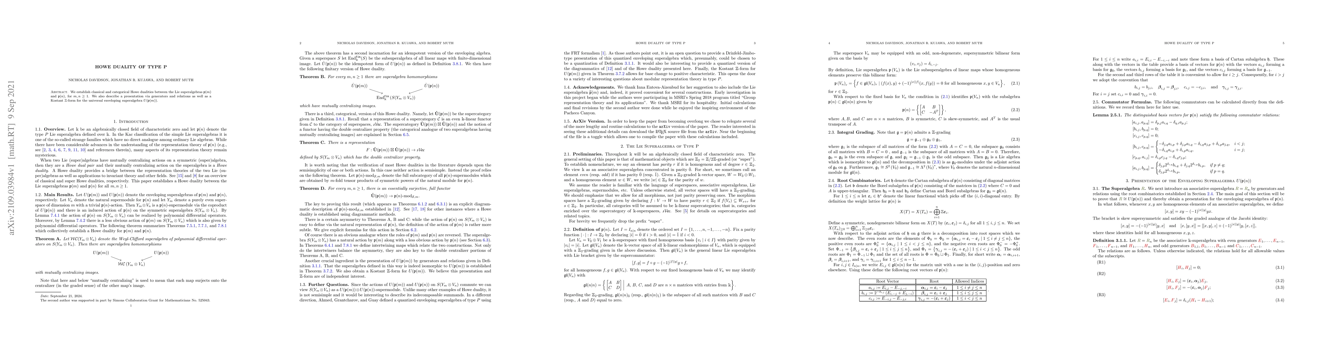 This paper establishes classical and categorical Howe dualities between Lie superalgebras $\mathfrak{p}(m)$ and $\mathfrak{p}(n)$, and provides a presentation of the universal enveloping superalgebra $U(\mathfrak{p}(m))$ along with a Kostant $\mathbb{Z}$-form.