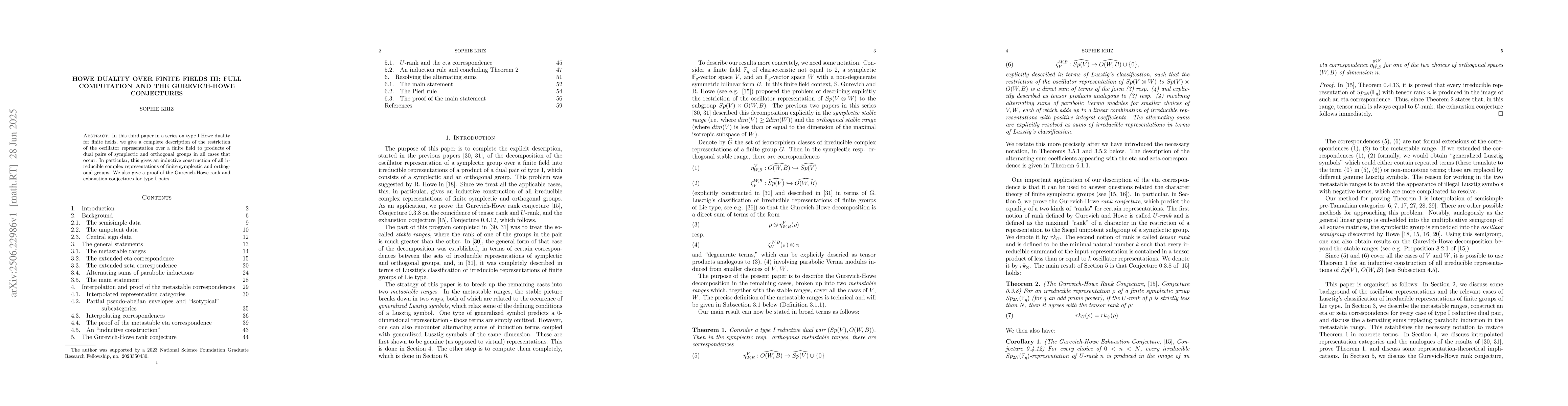 In this third paper in a series on type I Howe duality for finite fields, we give a complete description of the restriction of the oscillator representation over a finite field to products of dual pairs of symplectic and orthogonal groups in all cases that occur. In particular, this gives an inductive construction of all irreducible complex representations of finite symplectic and orthogonal groups. We also give a proof of the Gurevich-Howe rank and exhaustion conjectures for type I pairs.