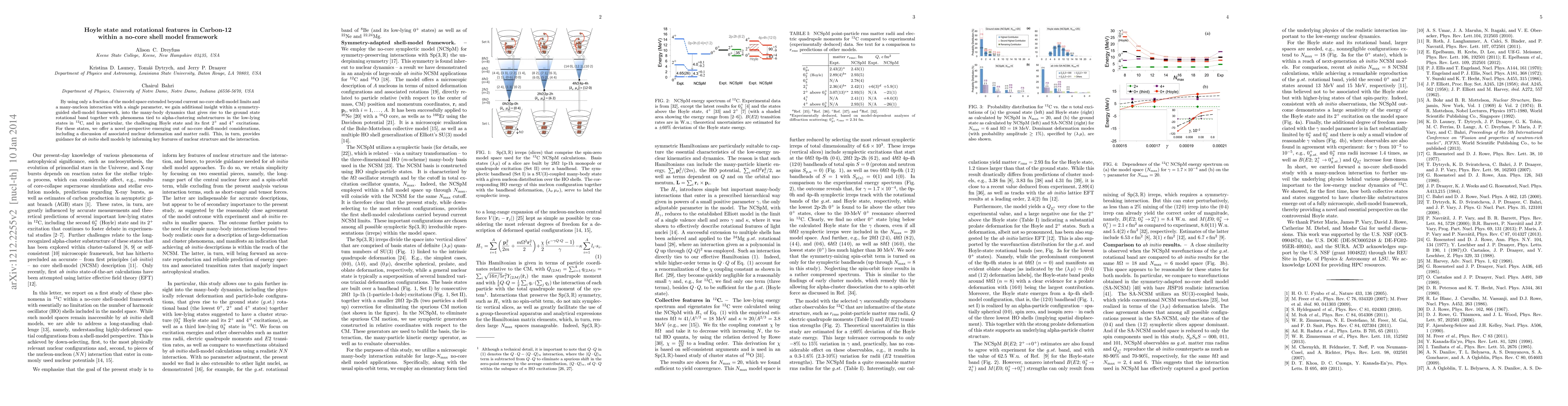 By using only a fraction of the model space extended beyond current no-core shell-model limits and a schematic effective many-nucleon interaction, we gain additional insight within a symmetry-guided shell-model framework, into the many-body dynamics that gives rise to the ground state rotational band together with phenomena tied to alpha-clustering substructures in the low-lying states in C-12, and in particular, the challenging Hoyle state and its first 2+ excitation. For these states, we offer a novel perspective emerging out of no-core shell-model considerations, including a discussion of associated nuclear shapes and matter radii. This, in turn, provides guidance for ab initio shell models by informing key features of nuclear structure and the interaction.
