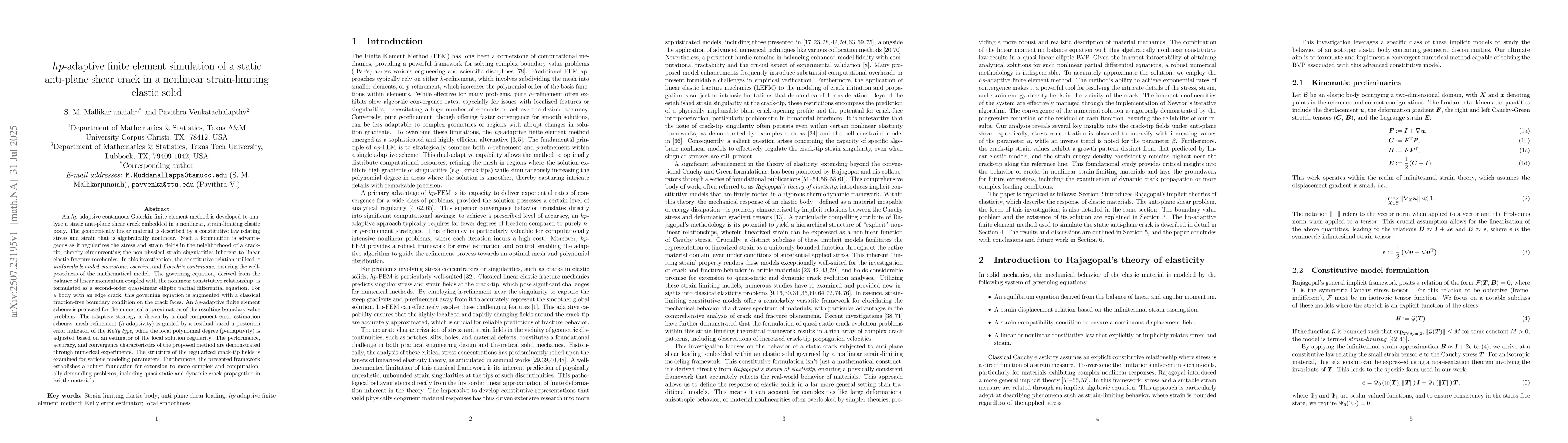An $hp$-adaptive continuous Galerkin finite element method is developed to analyze a static anti-plane shear crack embedded in a nonlinear, strain-limiting elastic body. The geometrically linear material is described by a constitutive law relating stress and strain that is algebraically nonlinear. In this investigation, the constitutive relation utilized is \textit{uniformly bounded}, \textit{monotone}, \textit{coercive}, and \textit{Lipschitz continuous}, ensuring the well-posedness of the mathematical model. The governing equation, derived from the balance of linear momentum coupled with the nonlinear constitutive relationship, is formulated as a second-order quasi-linear elliptic partial differential equation. For a body with an edge crack, this governing equation is augmented with a classical traction-free boundary condition on the crack faces. An $hp$-adaptive finite element scheme is proposed for the numerical approximation of the resulting boundary value problem. The adaptive strategy is driven by a dual-component error estimation scheme: mesh refinement ($h$-adaptivity) is guided by a residual-based a posteriori error indicator of the \textit{Kelly type}, while the local polynomial degree ($p$-adaptivity) is adjusted based on an estimator of the local solution regularity. The performance, accuracy, and convergence characteristics of the proposed method are demonstrated through numerical experiments. The structure of the regularized crack-tip fields is examined for various modeling parameters. Furthermore, the presented framework establishes a robust foundation for extension to more complex and computationally demanding problems, including quasi-static and dynamic crack propagation in brittle materials.