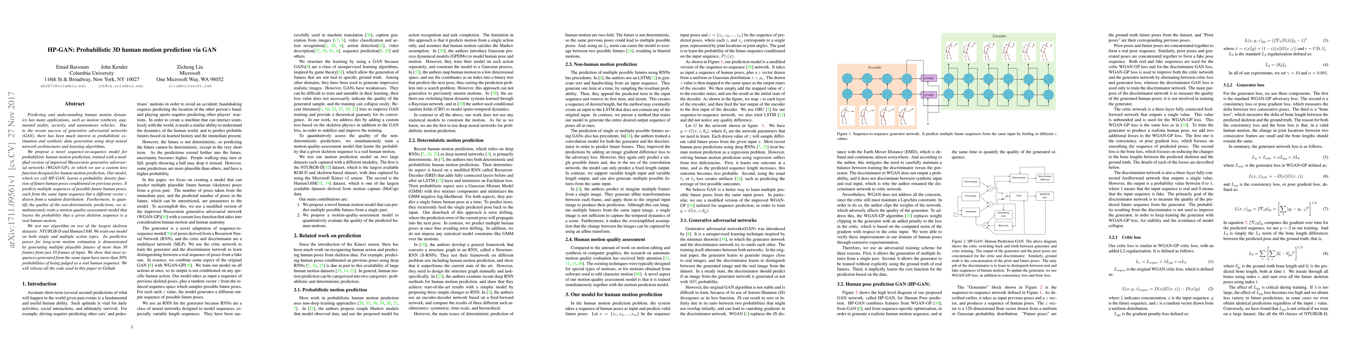 HP-GAN proposes a novel sequence-to-sequence model for probabilistic human motion prediction using a modified Wasserstein GAN with gradient penalty, generating multiple plausible future human poses from past poses. The model also trains a motion-quality-assessment model to evaluate the realism of predicted sequences, demonstrating strong performance on large skeleton datasets.