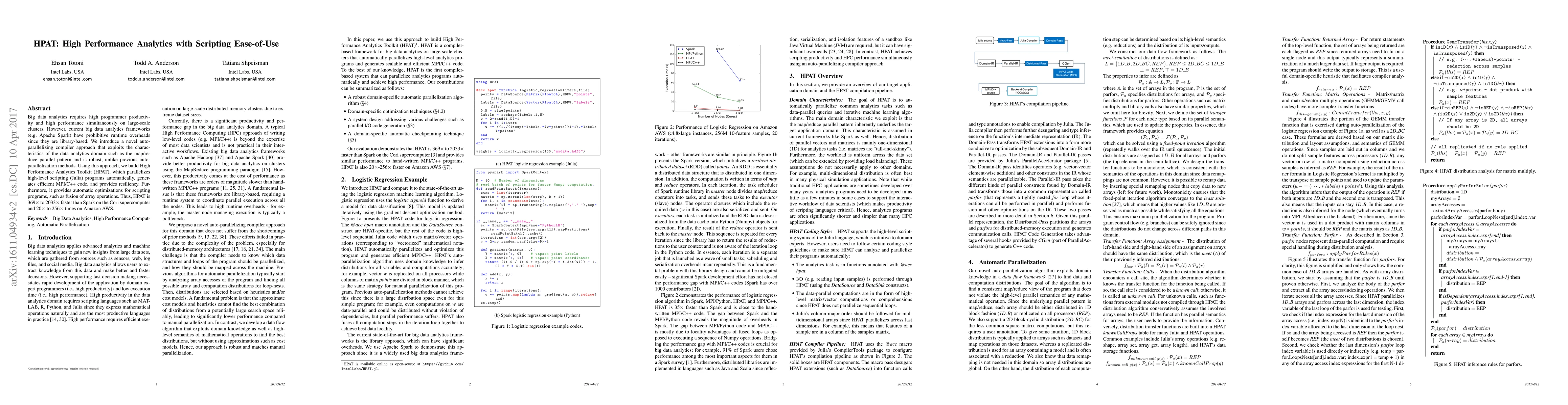 The paper introduces HPAT, a novel auto-parallelizing compiler that enhances big data analytics performance by automatically transforming high-level scripting programs into efficient MPI/C++ code, achieving significant speedups over Apache Spark on large-scale clusters. HPAT provides automatic optimizations and resiliency, demonstrating substantial performance improvements on both Cori supercomputer and Amazon AWS.