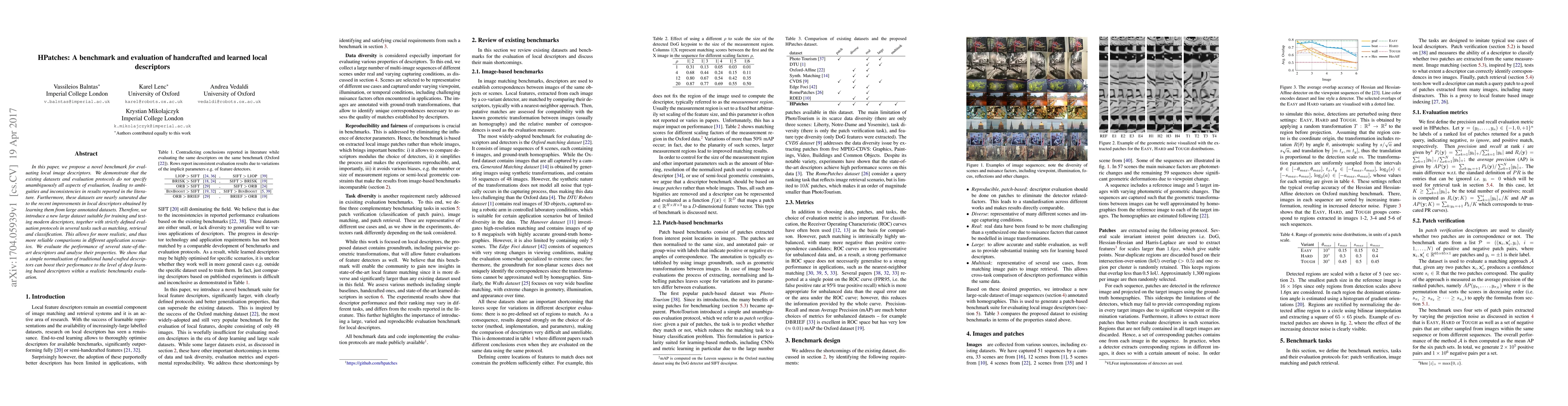 The paper presents HPatches, a new benchmark for local image descriptor evaluation, addressing ambiguities in existing datasets. It introduces a large dataset and strict protocols for tasks like matching, retrieval, and classification. The study reveals that normalizing traditional descriptors can match deep learning-based methods' performance, highlighting the importance of proper evaluation methods.