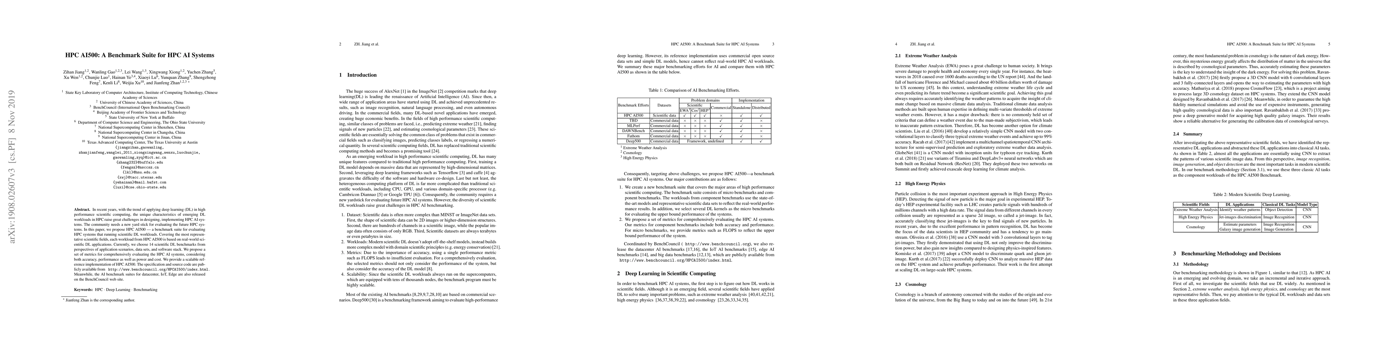 The paper introduces HPC AI500, a benchmark suite for evaluating high-performance computing (HPC) systems running deep learning workloads, addressing the need for new standards in this evolving field. The suite includes 14 representative scientific DL benchmarks and proposes metrics for comprehensive evaluation, covering accuracy, performance, power, and cost.