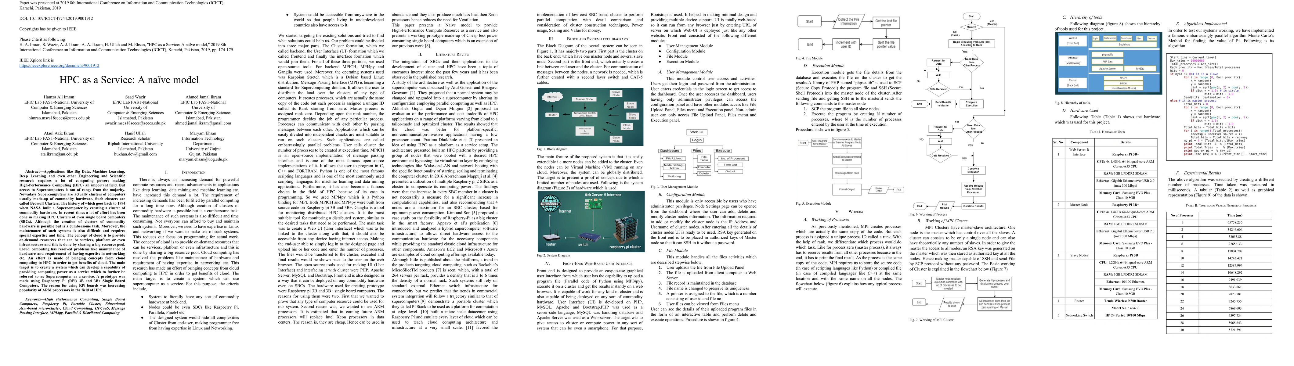 Applications like Big Data, Machine Learning, Deep Learning and even other Engineering and Scientific research requires a lot of computing power; making High-Performance Computing (HPC) an important field. But access to Supercomputers is out of range from the majority. Nowadays Supercomputers are actually clusters of computers usually made-up of commodity hardware. Such clusters are called Beowulf Clusters. The history of which goes back to 1994 when NASA built a Supercomputer by creating a cluster of commodity hardware. In recent times a lot of effort has been done in making HPC Clusters of even single board computers (SBCs). Although the creation of clusters of commodity hardware is possible but is a cumbersome task. Moreover, the maintenance of such systems is also difficult and requires special expertise and time. The concept of cloud is to provide on-demand resources that can be services, platform or even infrastructure and this is done by sharing a big resource pool. Cloud computing has resolved problems like maintenance of hardware and requirement of having expertise in networking etc. An effort is made of bringing concepts from cloud computing to HPC in order to get benefits of cloud. The main target is to create a system which can develop a capability of providing computing power as a service which to further be referred to as Supercomputer as a service. A prototype was made using Raspberry Pi (RPi) 3B and 3B+ Single Board Computers. The reason for using RPi boards was increasing popularity of ARM processors in the field of HPC