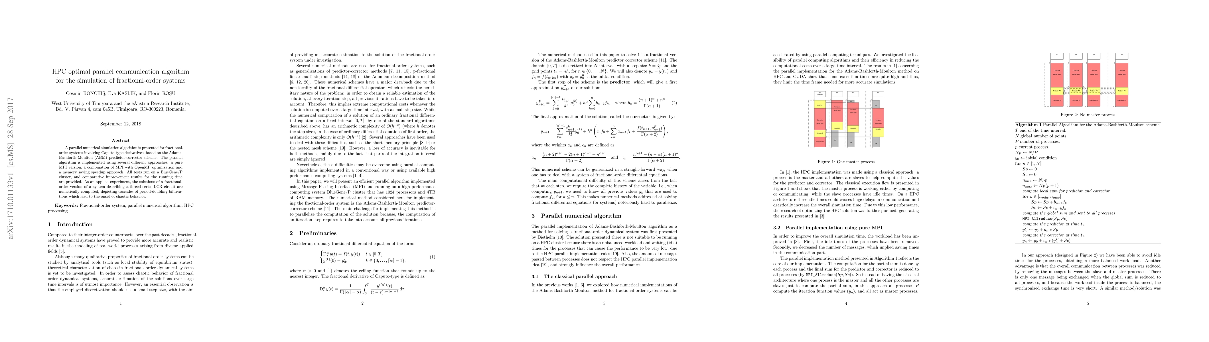 A parallel numerical simulation algorithm is presented for fractional-order systems, showing a 3x improvement in running time using the MPI-OpenMP combination, and demonstrating chaotic behavior in a forced series LCR circuit.