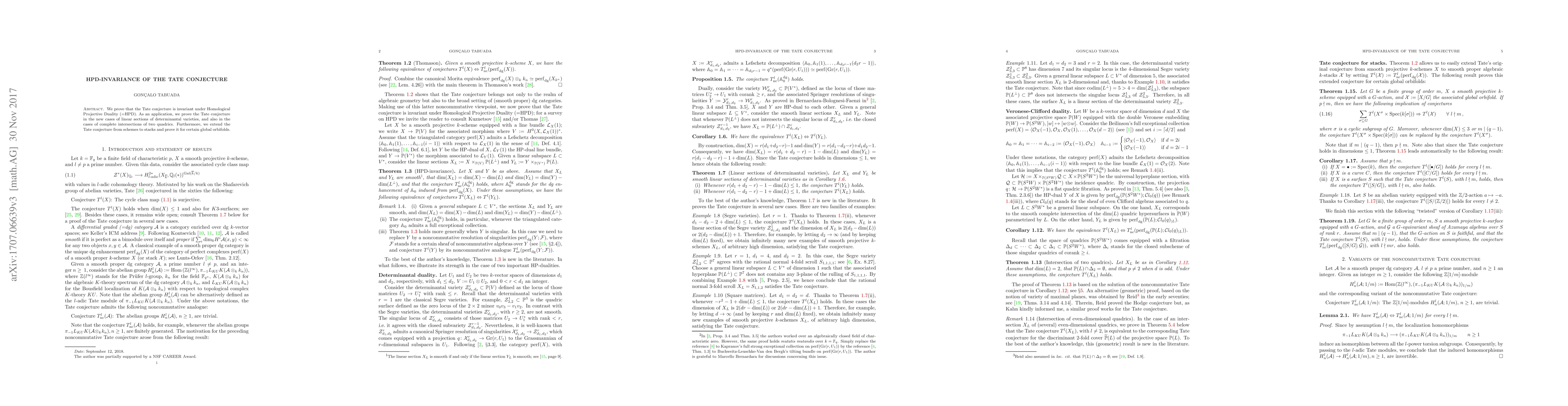 We prove that the Tate conjecture is invariant under Homological Projective Duality (=HPD). As an application, we prove the Tate conjecture in the new cases of linear sections of determinantal varieties, and also in the cases of complete intersections of two quadrics. Furthermore, we extend the Tate conjecture from schemes to stacks and prove it for certain global orbifolds