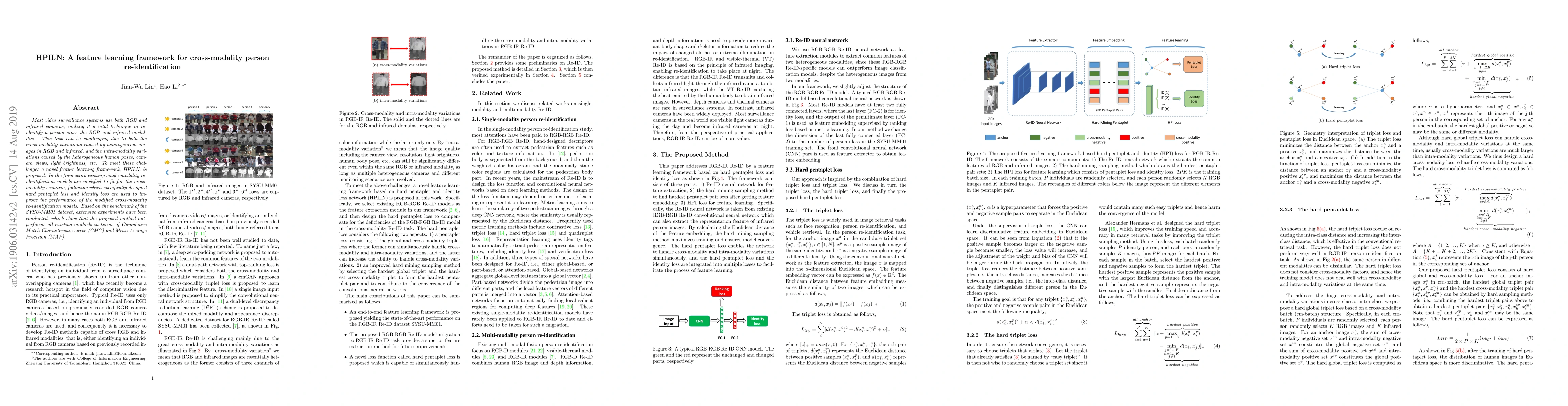 The HPILN framework modifies existing single-modality re-identification models for cross-modality person re-identification, employing hard pentaplet and identity loss to improve performance. Experiments on the SYSU-MM01 dataset show superior results compared to existing methods.