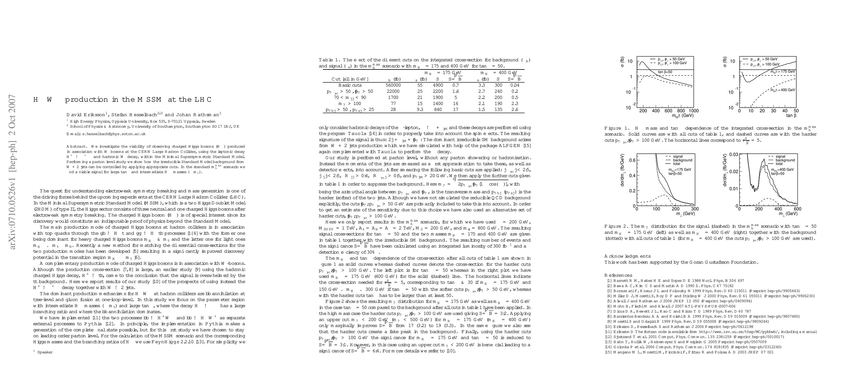 The study investigates the production of charged Higgs bosons (H±) in association with W bosons at the LHC within the Minimal Supersymmetric Standard Model (MSSM). It performs a parton-level analysis, controlling the irreducible Standard Model background from W + 2 jets using appropriate cuts.