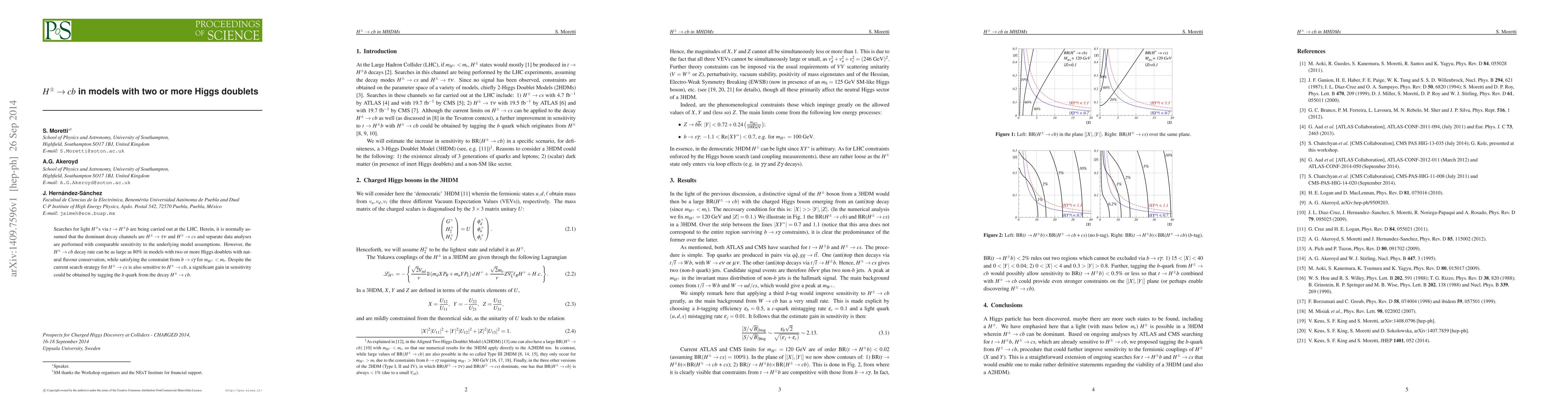 Searches for light $H^\pm$s via $t\to H^\pm b$ are being carried out at the LHC. Herein, it is normally assumed that the dominant decay channels are $H^\pm\to \tau\nu$ and $H^\pm\to cs$ and separate data analyses are performed with comparable sensitivity to the underlying model assumptions. However, the $H^\pm\to cb$ decay rate can be as large as $80\%$ in models with two or more Higgs doublets with natural flavour conservation, while satisfying the constraint from $b\to s\gamma$ for $m_{H^\pm}< m_t$. Despite the current search strategy for $H^\pm\to cs$ is also sensitive to $H^\pm\to cb$, a significant gain in sensitivity could be obtained by tagging the $b$ quark from the decay $H^\pm\to cb$.