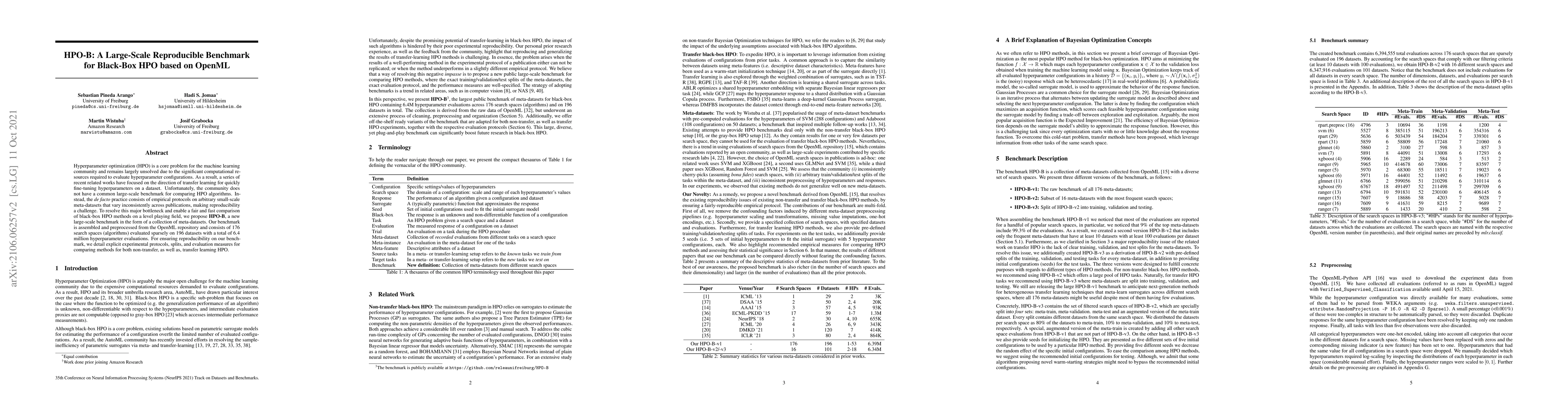 HPO-B is a large-scale reproducible benchmark for black-box hyperparameter optimization (HPO) created from OpenML datasets, consisting of 176 search spaces and 196 datasets with 6.4 million evaluations to facilitate fair comparisons of HPO methods. The benchmark includes detailed protocols to ensure reproducibility across non-transfer and transfer learning approaches.