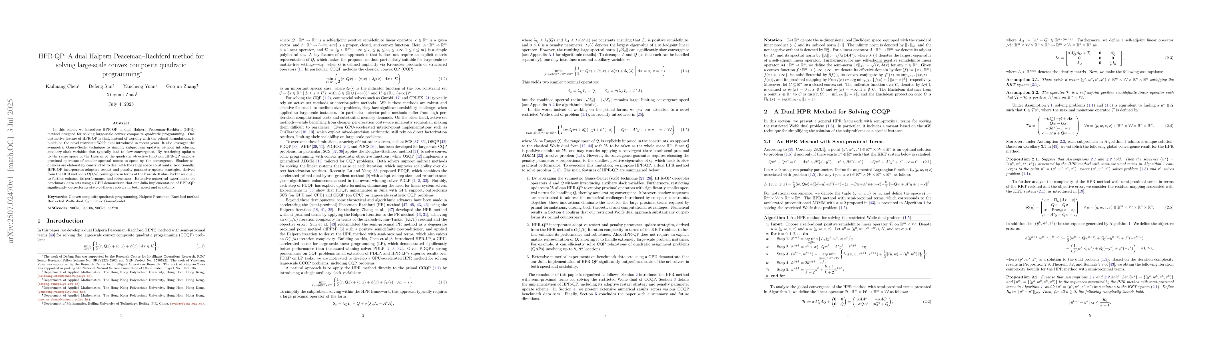 In this paper, we introduce HPR-QP, a dual Halpern Peaceman-Rachford (HPR) method designed for solving large-scale convex composite quadratic programming. One distinctive feature of HPR-QP is that, instead of working with the primal formulations, it builds on the novel restricted Wolfe dual introduced in recent years. It also leverages the symmetric Gauss-Seidel technique to simplify subproblem updates without introducing auxiliary slack variables that typically lead to slow convergence. By restricting updates to the range space of the Hessian of the quadratic objective function, HPR-QP employs proximal operators of smaller spectral norms to speed up the convergence. Shadow sequences are elaborately constructed to deal with the range space constraints. Additionally, HPR-QP incorporates adaptive restart and penalty parameter update strategies, derived from the HPR method's $O(1/k)$ convergence in terms of the Karush-Kuhn-Tucker residual, to further enhance its performance and robustness. Extensive numerical experiments on benchmark data sets using a GPU demonstrate that our Julia implementation of HPR-QP significantly outperforms state-of-the-art solvers in both speed and scalability.