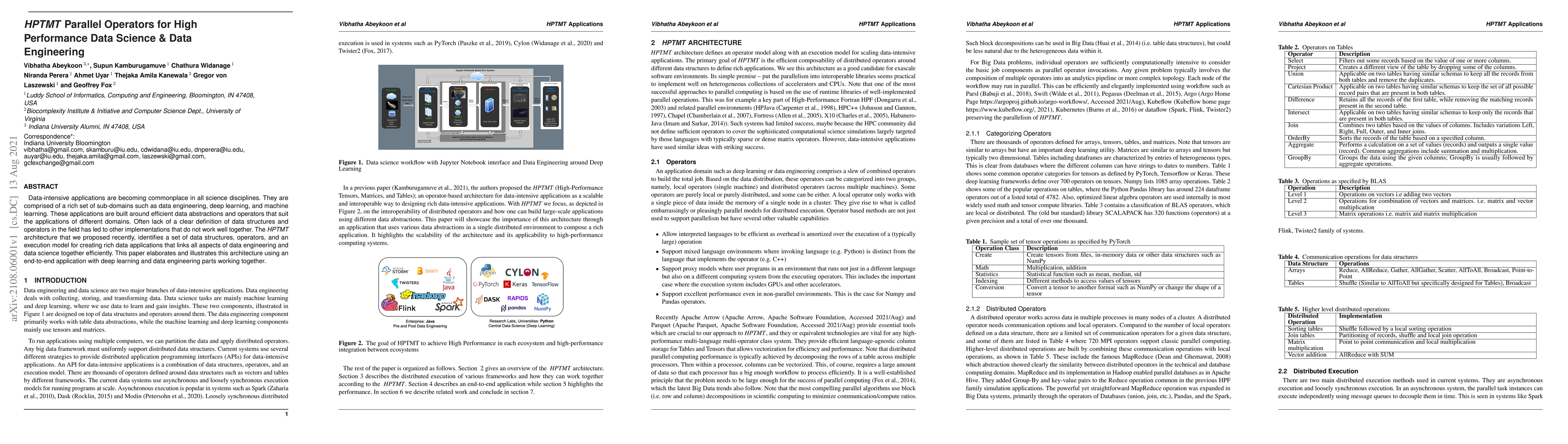 Data-intensive applications are becoming commonplace in all science disciplines. They are comprised of a rich set of sub-domains such as data engineering, deep learning, and machine learning. These applications are built around efficient data abstractions and operators that suit the applications of different domains. Often lack of a clear definition of data structures and operators in the field has led to other implementations that do not work well together. The HPTMT architecture that we proposed recently, identifies a set of data structures, operators, and an execution model for creating rich data applications that links all aspects of data engineering and data science together efficiently. This paper elaborates and illustrates this architecture using an end-to-end application with deep learning and data engineering parts working together.