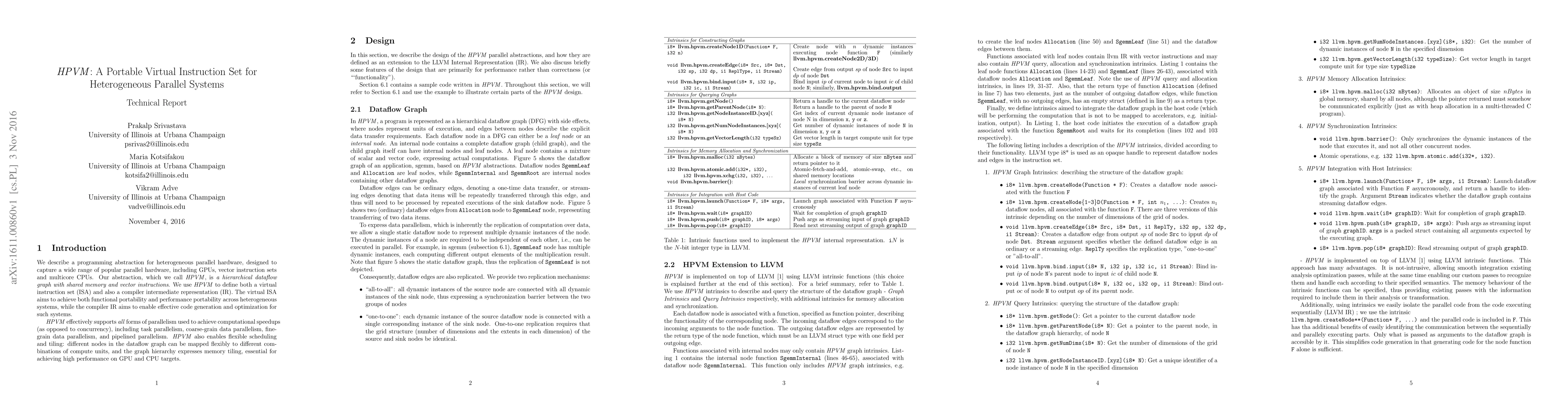 HPVM is a portable virtual instruction set designed for heterogeneous parallel systems, providing a hierarchical dataflow graph with shared memory and vector instructions to support various parallelism forms. It aims to achieve both functional and performance portability across different hardware, including GPUs and multicore CPUs.