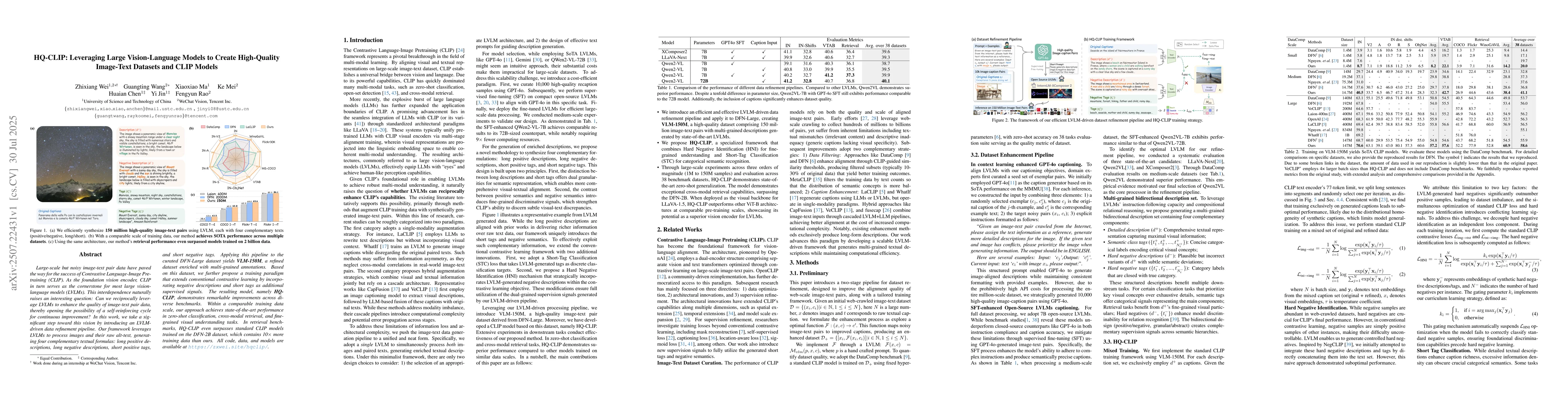 The paper introduces an LVLM-driven data refinement pipeline that processes images and raw alt-text to generate complementary textual formulas, enhancing the DFN-Large dataset to VLM-150M with multi-grained annotations. It then proposes a training paradigm that incorporates negative descriptions and short tags as additional supervised signals, resulting in the HQ-CLIP model.