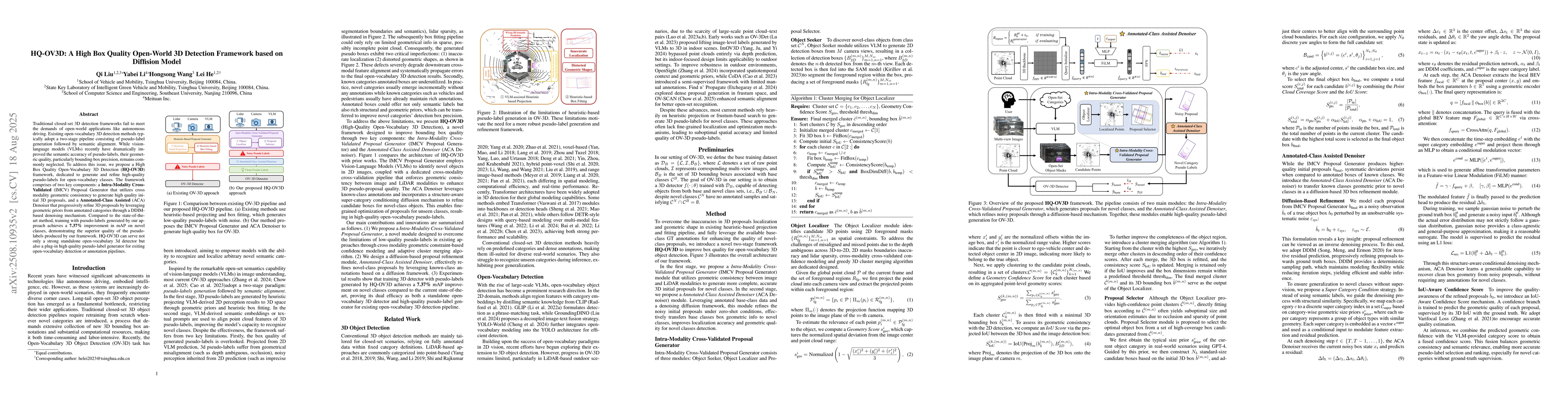 Traditional closed-set 3D detection frameworks fail to meet the demands of open-world applications like autonomous driving. Existing open-vocabulary 3D detection methods typically adopt a two-stage pipeline consisting of pseudo-label generation followed by semantic alignment. While vision-language models (VLMs) recently have dramatically improved the semantic accuracy of pseudo-labels, their geometric quality, particularly bounding box precision, remains commonly neglected. To address this issue, we propose a High Box Quality Open-Vocabulary 3D Detection (HQ-OV3D) framework, dedicated to generate and refine high-quality pseudo-labels for open-vocabulary classes. The framework comprises two key components: an Intra-Modality Cross-Validated (IMCV) Proposal Generator that utilizes cross-modality geometric consistency to generate high-quality initial 3D proposals, and an Annotated-Class Assisted (ACA) Denoiser that progressively refines 3D proposals by leveraging geometric priors from annotated categories through a DDIM-based denoising mechanism. Compared to the state-of-the-art method, training with pseudo-labels generated by our approach achieves a 7.37% improvement in mAP on novel classes, demonstrating the superior quality of the pseudo-labels produced by our framework. HQ-OV3D can serve not only as a strong standalone open-vocabulary 3D detector but also as a plug-in high-quality pseudo-label generator for existing open-vocabulary detection or annotation pipelines.
