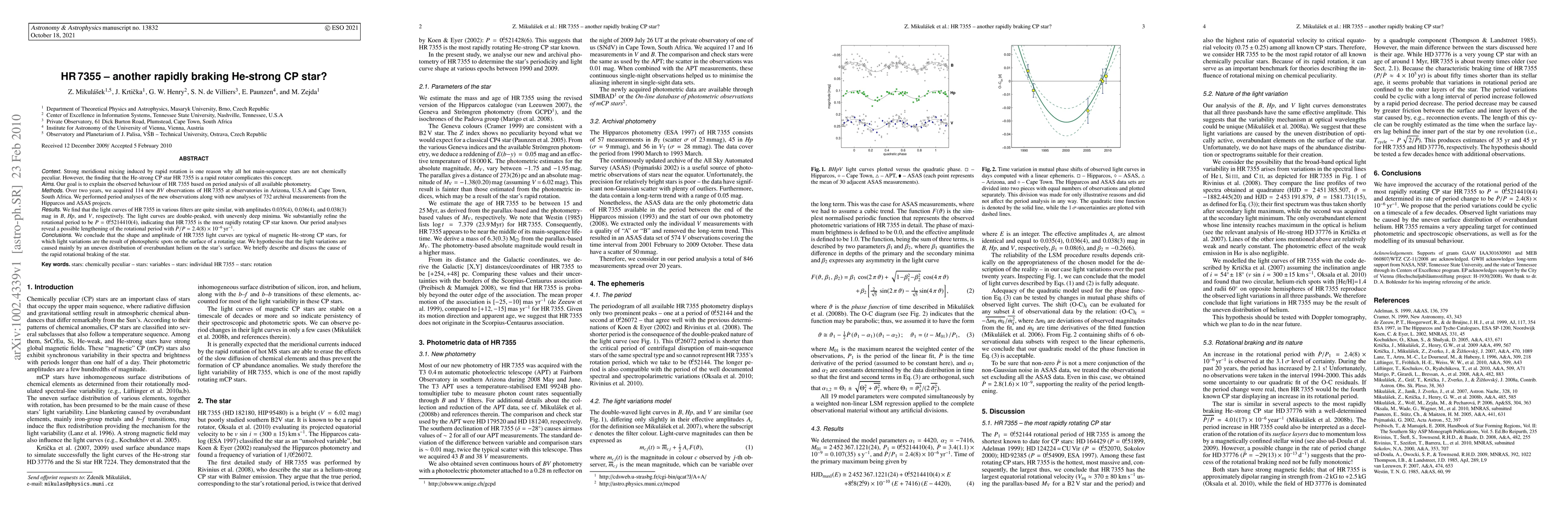 HR 7355, a rapidly rotating He-strong CP star, exhibits double-peaked light curves and a refined rotational period of 0.5214410(4) days, making it the fastest rotating CP star known. The light variations are attributed to photospheric spots and an uneven helium distribution, suggesting strong meridional mixing.