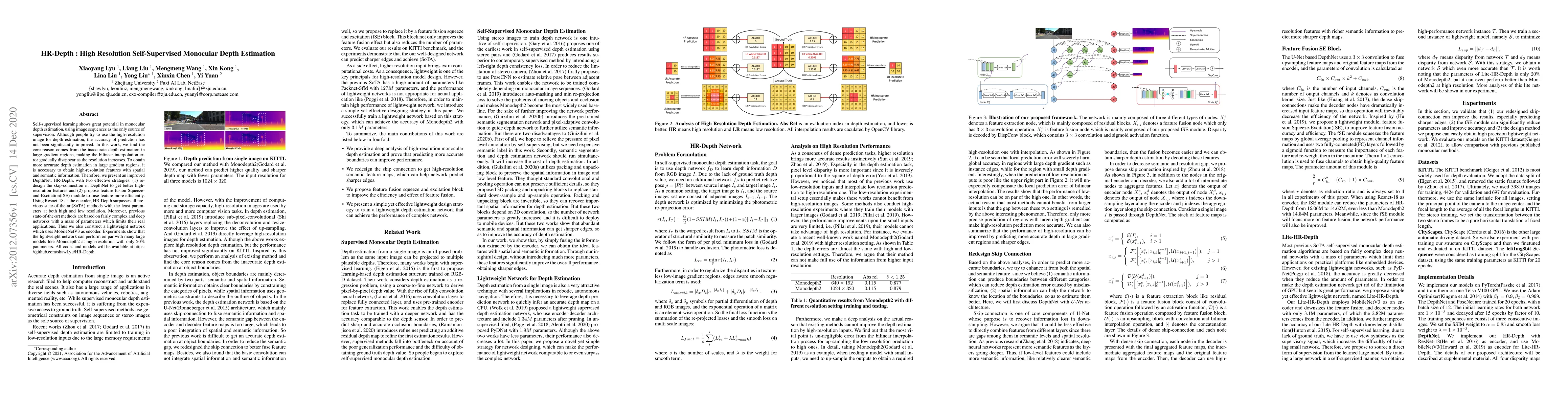 Self-supervised learning shows great potential in monoculardepth estimation, using image sequences as the only source ofsupervision. Although people try to use the high-resolutionimage for depth estimation, the accuracy of prediction hasnot been significantly improved. In this work, we find thecore reason comes from the inaccurate depth estimation inlarge gradient regions, making the bilinear interpolation er-ror gradually disappear as the resolution increases. To obtainmore accurate depth estimation in large gradient regions, itis necessary to obtain high-resolution features with spatialand semantic information. Therefore, we present an improvedDepthNet, HR-Depth, with two effective strategies: (1) re-design the skip-connection in DepthNet to get better high-resolution features and (2) propose feature fusion Squeeze-and-Excitation(fSE) module to fuse feature more efficiently.Using Resnet-18 as the encoder, HR-Depth surpasses all pre-vious state-of-the-art(SoTA) methods with the least param-eters at both high and low resolution. Moreover, previousstate-of-the-art methods are based on fairly complex and deepnetworks with a mass of parameters which limits their realapplications. Thus we also construct a lightweight networkwhich uses MobileNetV3 as encoder. Experiments show thatthe lightweight network can perform on par with many largemodels like Monodepth2 at high-resolution with only20%parameters. All codes and models will be available at https://github.com/shawLyu/HR-Depth.