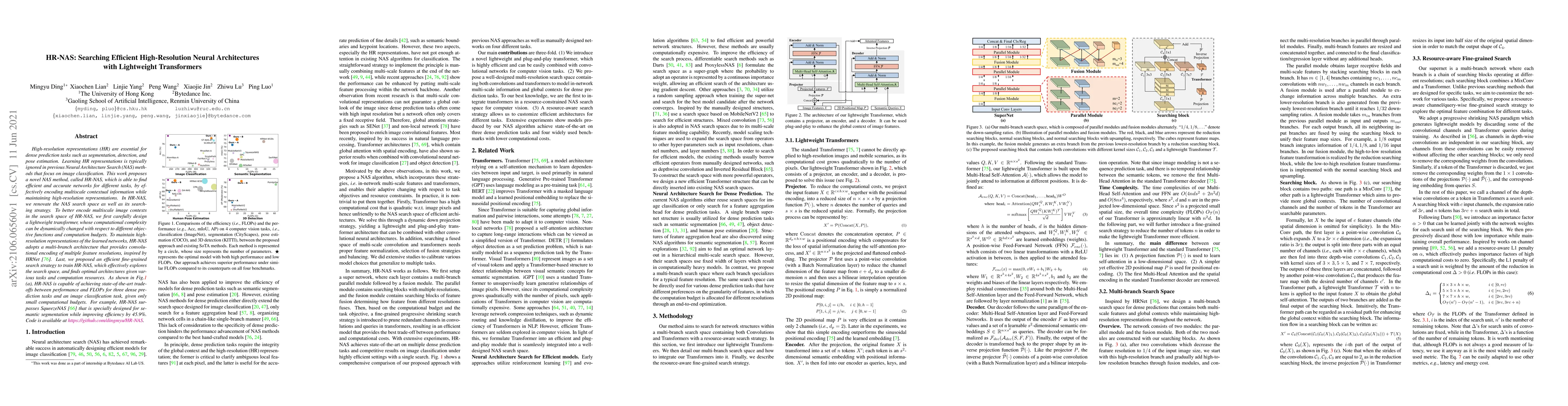 HR-NAS proposes a novel Neural Architecture Search method for dense prediction tasks, utilizing lightweight transformers and a multi-branch architecture to maintain high-resolution representations while efficiently encoding multiscale contexts. It achieves state-of-the-art performance-efficiency trade-offs for segmentation, detection, pose estimation, and classification.
