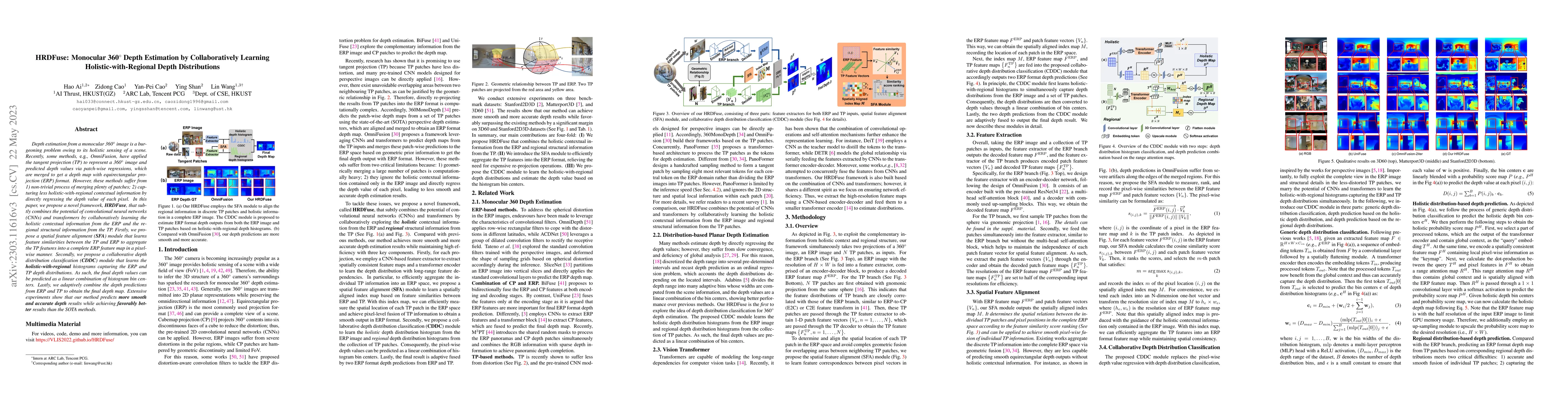 HRDFuse proposes a novel framework for monocular 360° depth estimation by leveraging convolutional neural networks and transformers to learn both holistic and regional contextual information. It achieves more accurate and smooth depth maps by combining spatial feature alignment and collaborative depth distribution classification modules.