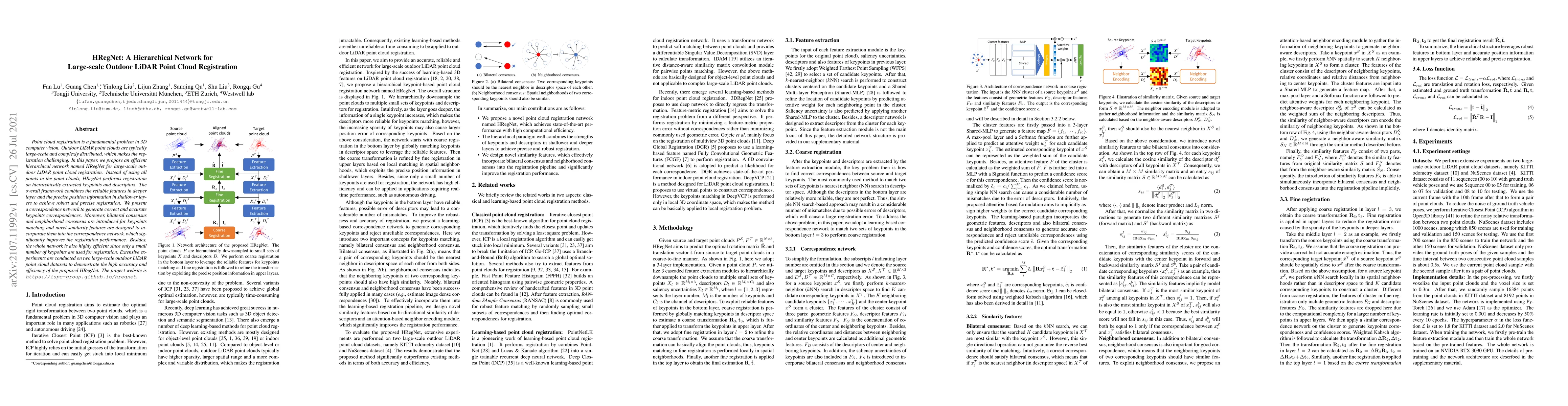 HRegNet is a hierarchical network designed to efficiently register large-scale outdoor LiDAR point clouds by focusing on keypoints and descriptors rather than all points. It combines deep features for reliability and shallow features for precision, significantly improving registration performance and efficiency.