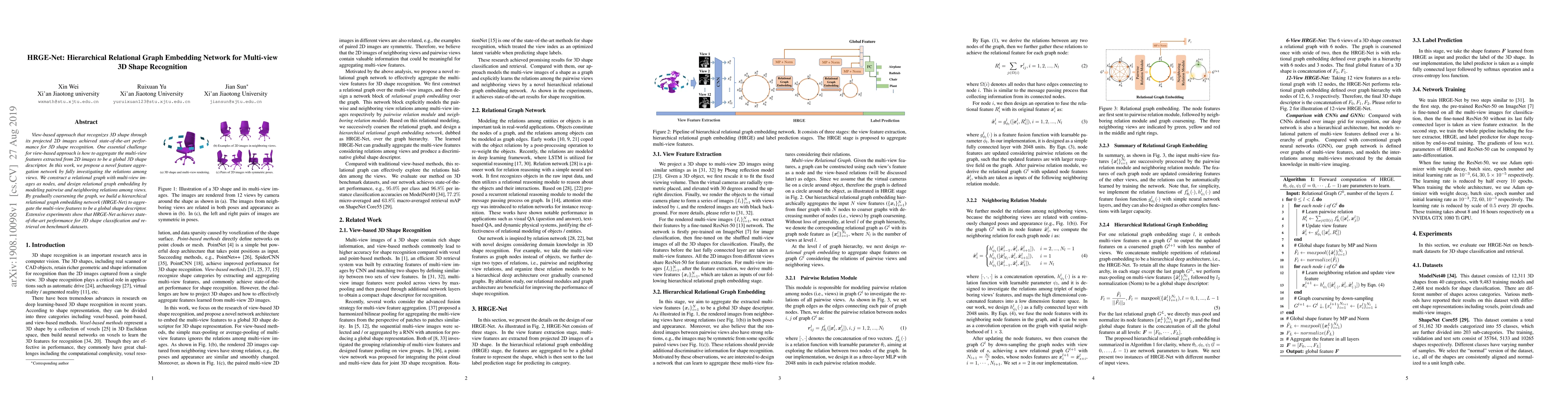 HRGE-Net proposes a hierarchical relational graph embedding network to aggregate multi-view features from 2D images for 3D shape recognition, achieving state-of-the-art performance in classification and retrieval tasks. The network models pairwise and neighboring relations among views to construct a global 3D shape descriptor.