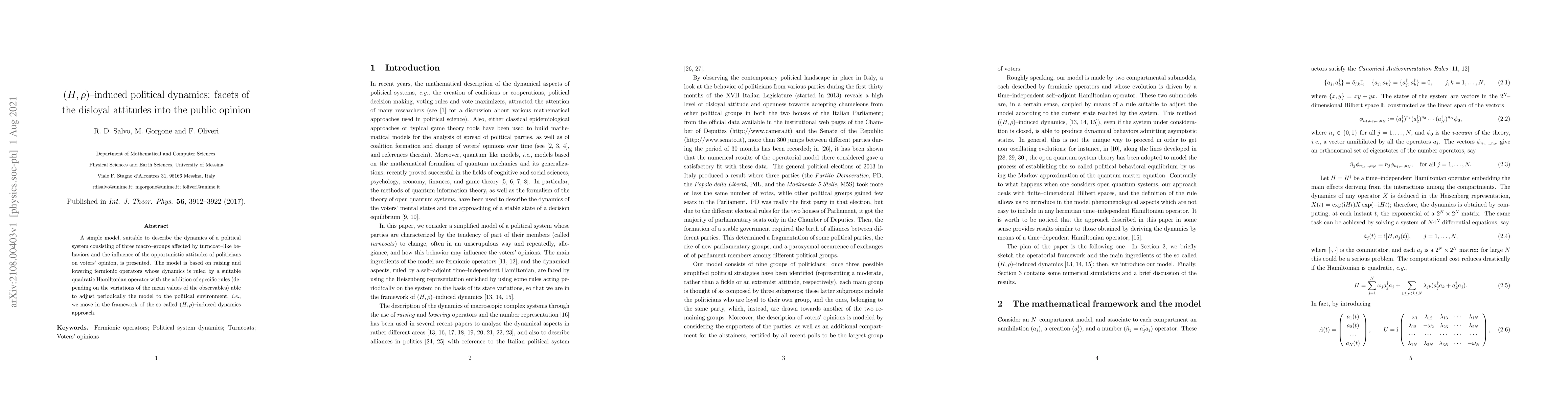 A simple model, suitable to describe the dynamics of a political system consisting of three macro--groups affected by turncoat--like behaviors and the influence of the opportunistic attitudes of politicians on voters' opinion, is presented. The model is based on raising and lowering fermionic operators whose dynamics is ruled by a suitable quadratic Hamiltonian operator with the addition of specific rules (depending on the variations of the mean values of the observables) able to adjust periodically the model to the political environment, \emph{i.e.}, we move in the framework of the so called $(H,\rho)$--induced dynamics approach.