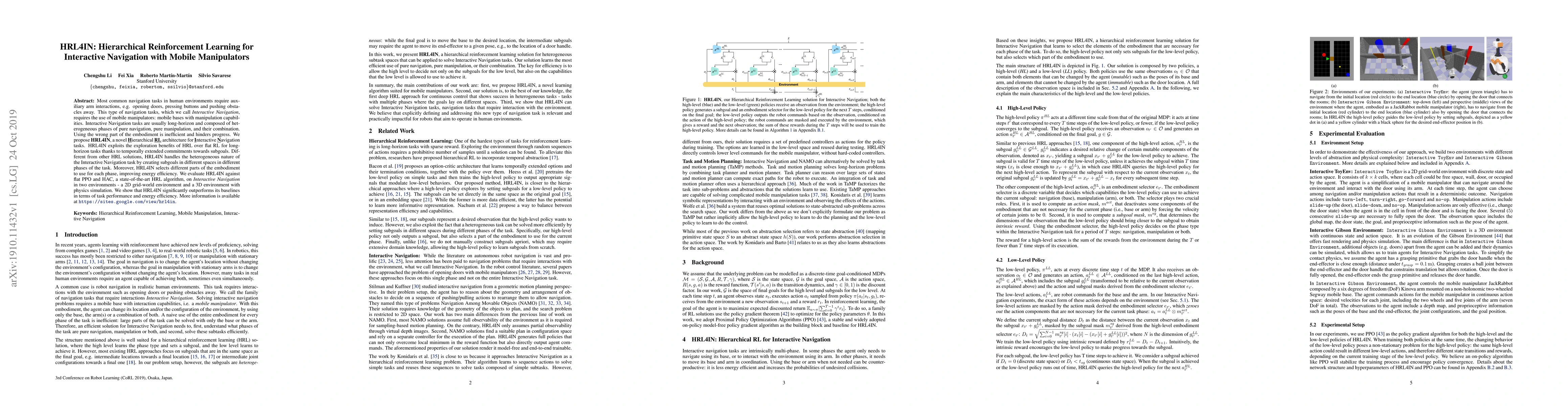 HRL4IN is a hierarchical reinforcement learning architecture designed for Interactive Navigation tasks involving mobile manipulators. It outperforms flat RL and other hierarchical RL methods by efficiently managing different phases of the task and selecting the appropriate embodiment parts, leading to better performance and energy efficiency.