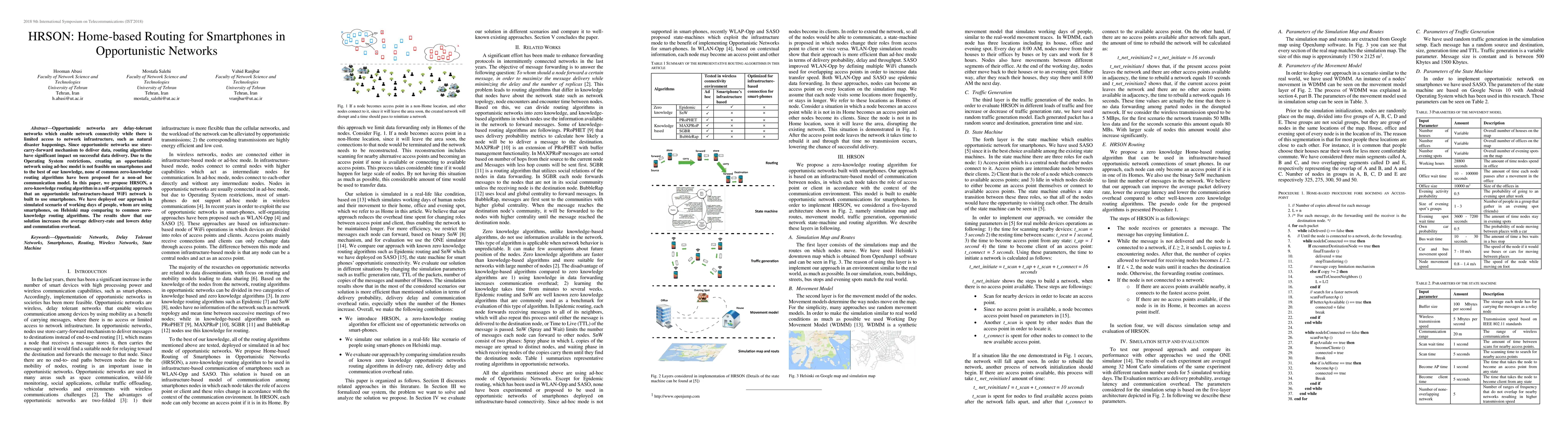 Title: HRSON: Home-based Routing for Smartphones in Opportunistic Networks Summary: This paper proposes HRSON, a zero-knowledge routing algorithm for smartphones in opportunistic networks, which builds an infrastructure-based WiFi network. Simulation results show that HRSON enhances delivery rates and reduces delay and overhead compared to existing algorithms.