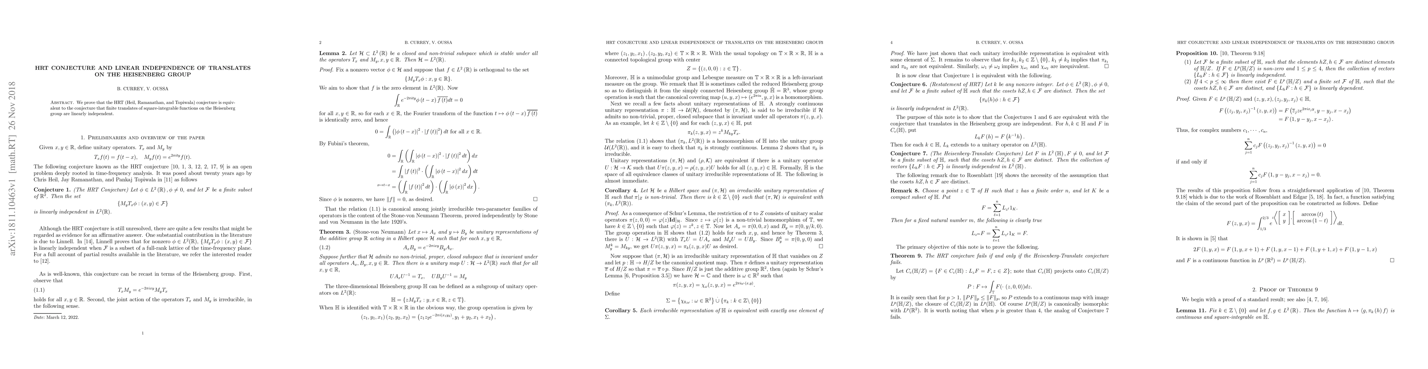 We prove that the HRT (Heil, Ramanathan, and Topiwala) conjecture is equivalent to the conjecture that finite translates of square-integrable functions on the Heisenberg group are linearly independent.