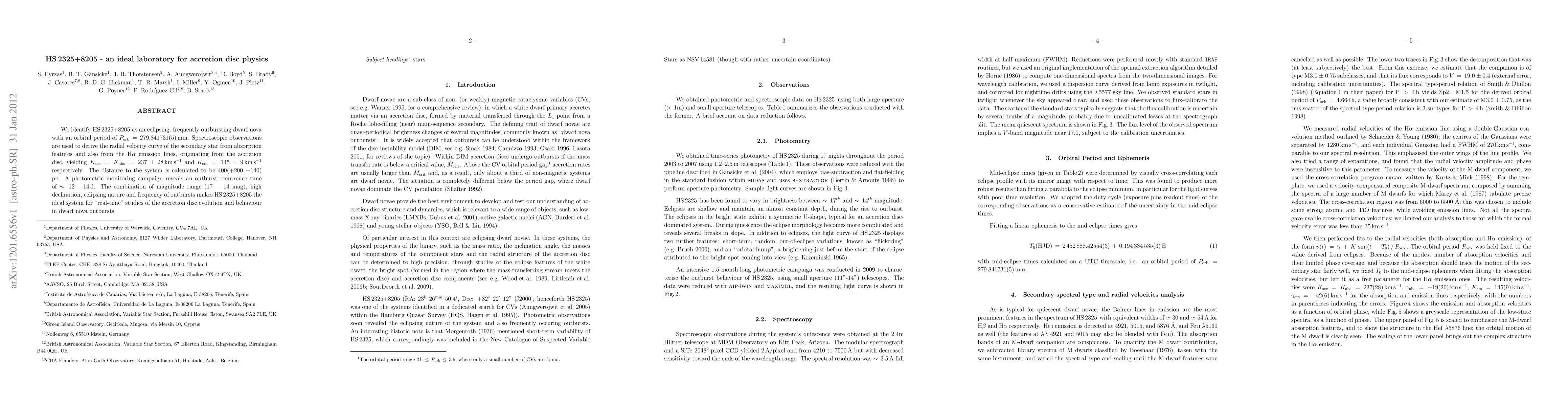 HS 2325+8205 is identified as an eclipsing dwarf nova with frequent outbursts, offering a unique opportunity for studying accretion disk physics due to its orbital period, spectroscopic radial velocity curves, and photometric monitoring. Its outburst recurrence and magnitude range make it ideal for real-time observations of accretion disk evolution.