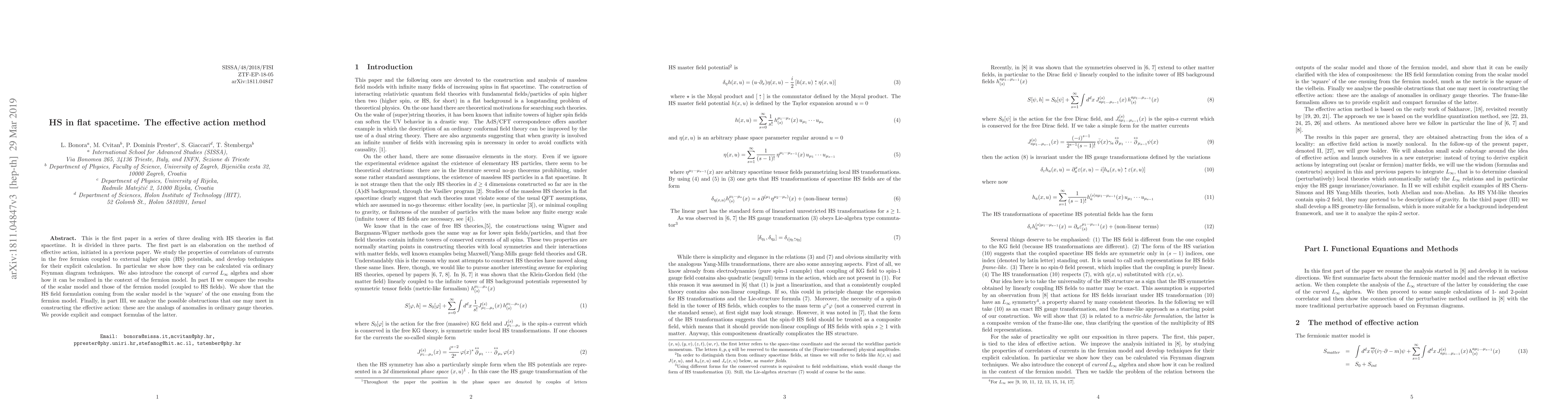 This is the first paper in a series of three dealing with HS theories in flat spacetime. It is divided in three parts. The first part is an elaboration on the method of effective action, initiated in a previous paper. We study the properties of correlators of currents in the free fermion coupled to external higher spin (HS) potentials, and develop techniques for their explicit calculation. In particular we show how they can be calculated via ordinary Feynman diagram techniques. We also introduce the concept of {\it curved} $L_\infty$ algebra and show how it can be realized in the context of the fermion model. In part II we compare the results of the scalar model and those of the fermion model (coupled to HS fields). We show that the HS field formulation coming from the scalar model is the `square' of the one ensuing from the fermion model. Finally, in part III, we analyze the possible obstructions that one may meet in constructing the effective action: these are the analogs of anomalies in ordinary gauge theories. We provide explicit and compact formulas of the latter.