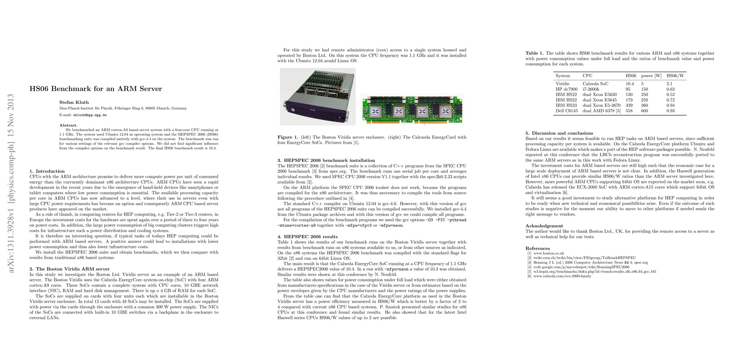 This research paper benchmarks an ARM server system using the HS06 benchmarking suite, finding no significant impact from compiler options on performance. The final result is 10.4, indicating a stable baseline for ARM servers.