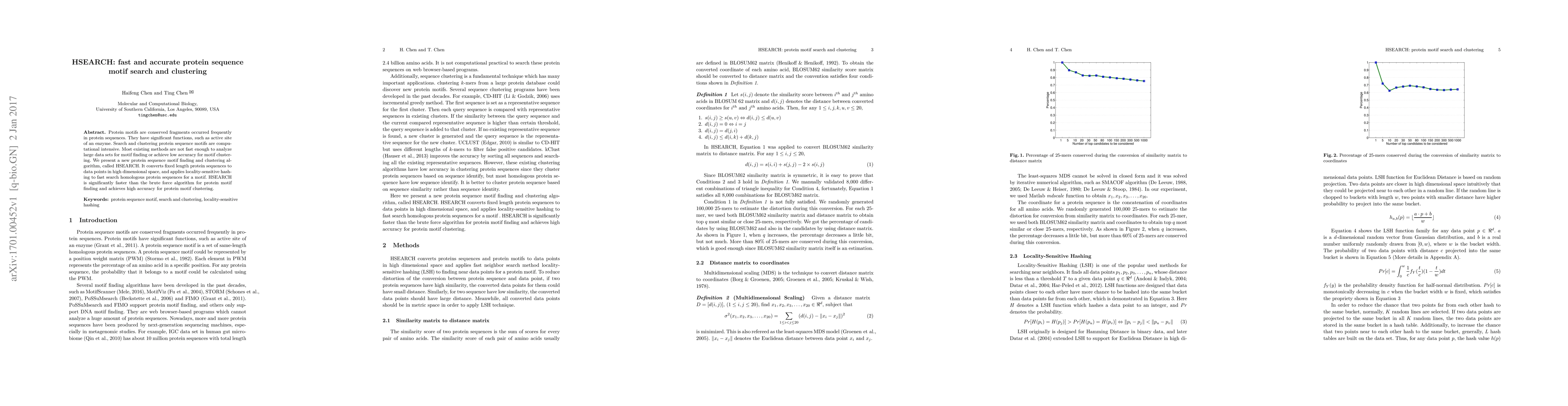 HSEARCH is a novel algorithm for fast and accurate protein sequence motif search and clustering, employing locality-sensitive hashing to efficiently identify motifs in large datasets while maintaining high accuracy. It outperforms brute force methods in speed and clustering precision.