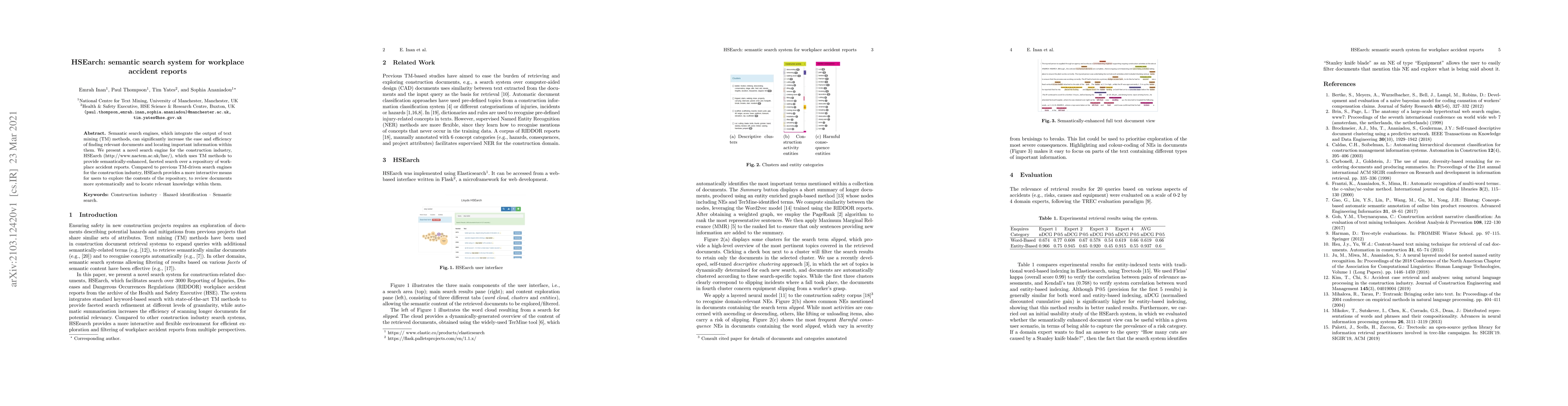HSEarch is a novel semantic search engine for construction industry accident reports, utilizing text mining methods to offer enhanced, faceted search capabilities. It provides a more interactive and systematic approach for users to explore and locate relevant information compared to previous search engines.