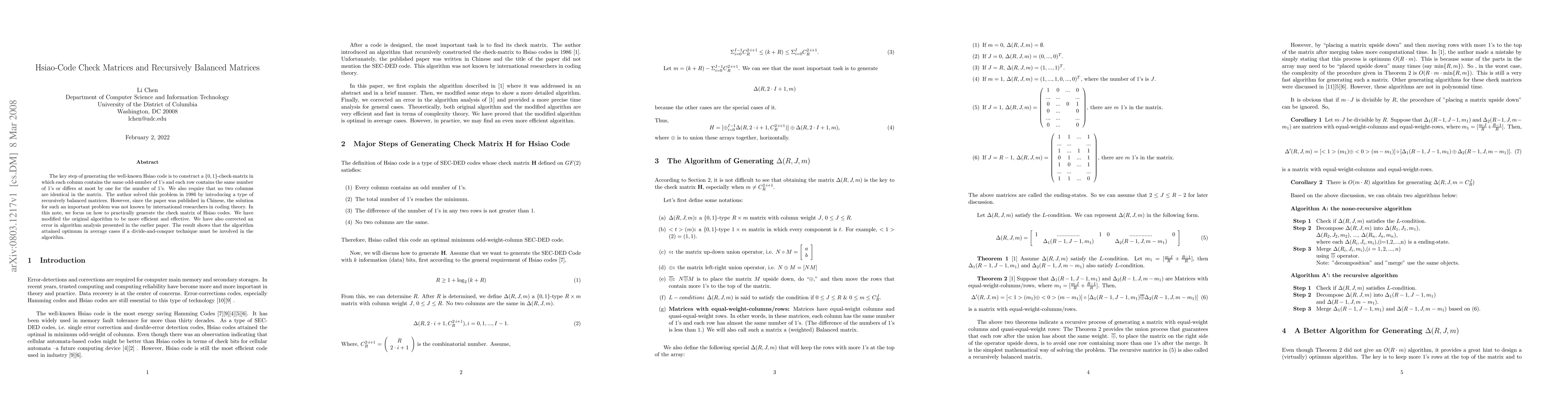 The key step of generating the well-known Hsiao code is to construct a {0,1}-check-matrix in which each column contains the same odd-number of 1's and each row contains the same number of 1's or differs at most by one for the number of 1's. We also require that no two columns are identical in the matrix. The author solved this problem in 1986 by introducing a type of recursively balanced matrices. However, since the paper was published in Chinese, the solution for such an important problem was not known by international researchers in coding theory. In this note, we focus on how to practically generate the check matrix of Hsiao codes. We have modified the original algorithm to be more efficient and effective. We have also corrected an error in algorithm analysis presented in the earlier paper. The result shows that the algorithm attained optimum in average cases if a divide-and-conquer technique must be involved in the algorithm.