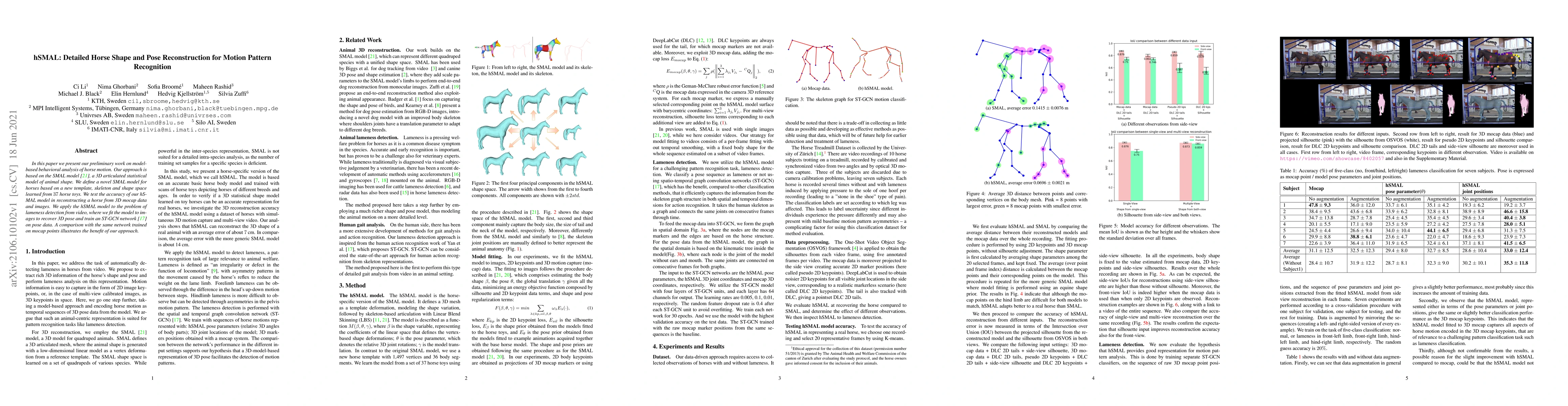 This paper introduces hSMAL, a novel 3D articulated statistical model for reconstructing horse shapes and poses from mocap data and images. It demonstrates the model's effectiveness in lameness detection by fitting it to video data and training an ST-GCN network, showing improved results compared to traditional mocap-based methods.