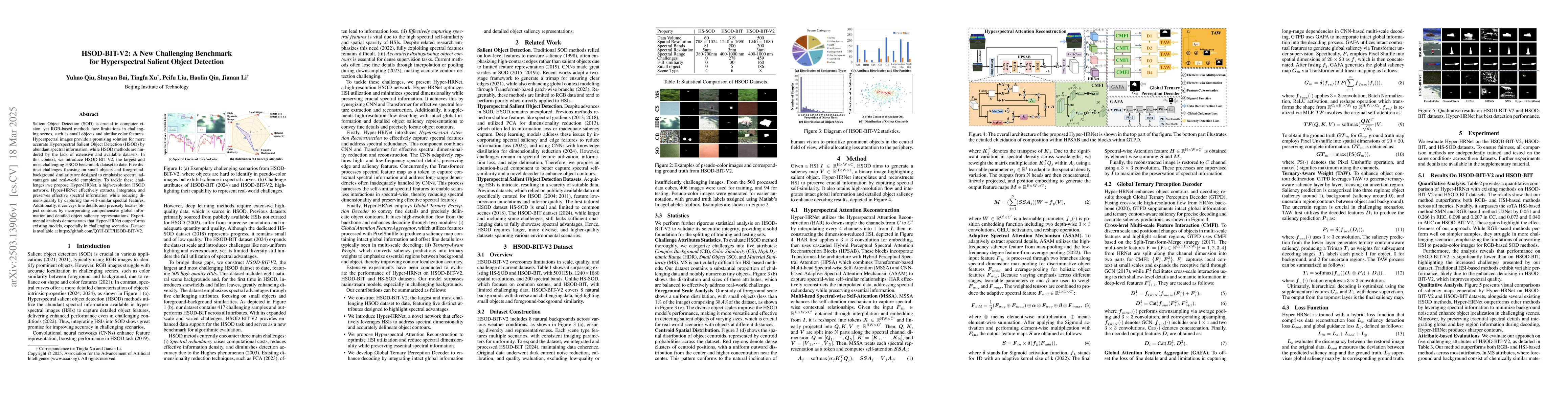 This paper introduces HSOD-BIT-V2, a new benchmark dataset for Hyperspectral Salient Object Detection (HSOD), addressing the lack of extensive datasets. It proposes Hyper-HRNet, a high-resolution network that leverages spectral information to detect salient objects, outperforming existing models in challenging scenarios.