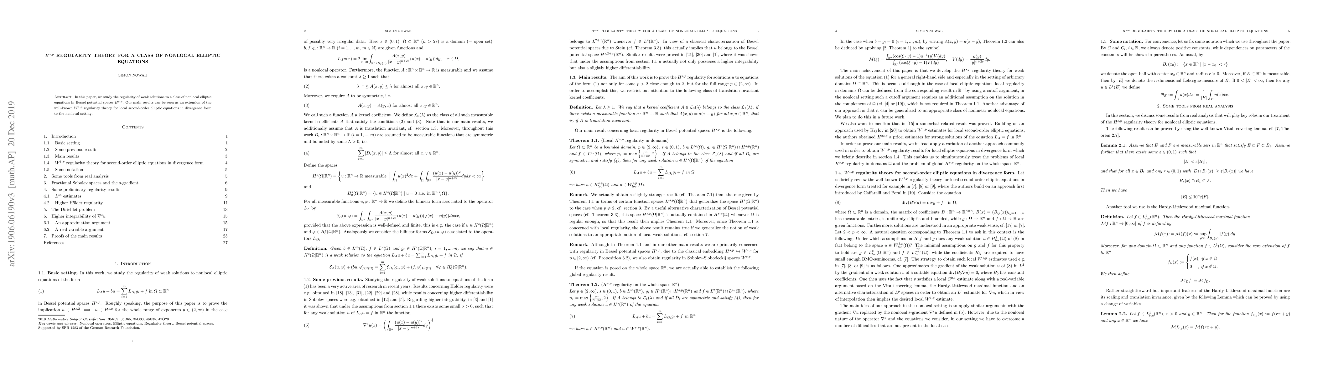 This paper extends the $W^{1,p}$ regularity theory for local elliptic equations to nonlocal elliptic equations, focusing on the regularity of weak solutions within the $H^{s,p}$ Bessel potential spaces. The results provide a framework for understanding the behavior of solutions in a nonlocal setting.