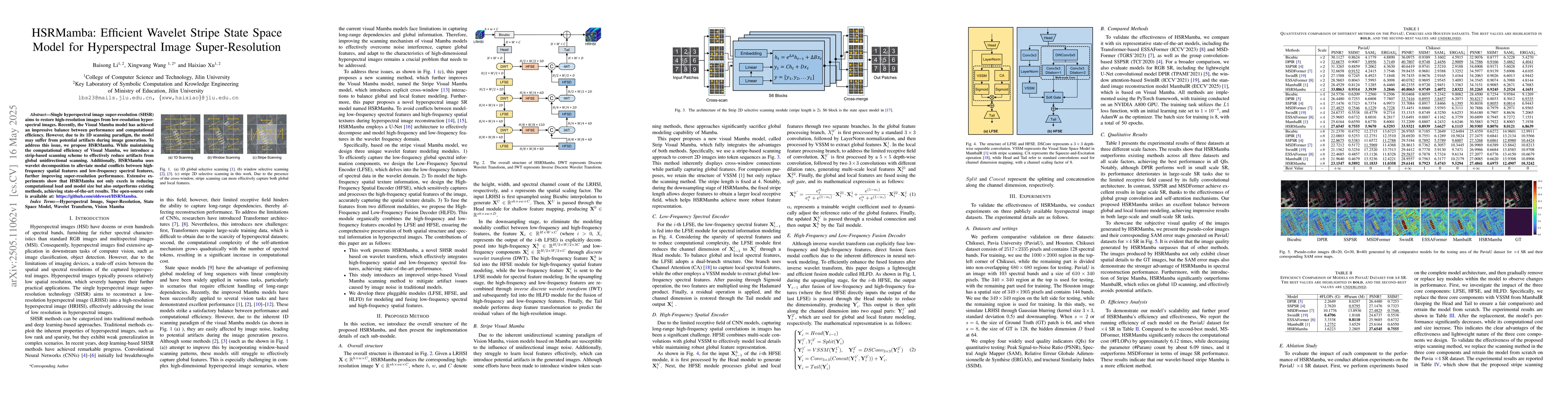 The research proposes HSRMamba, an efficient wavelet stripe state space model for hyperspectral image super-resolution. It builds upon the Visual Mamba model, maintaining its computational efficiency while introducing a strip-based scanning scheme to reduce artifacts and wavelet decomposition to manage modal conflicts between spatial and spectral features.