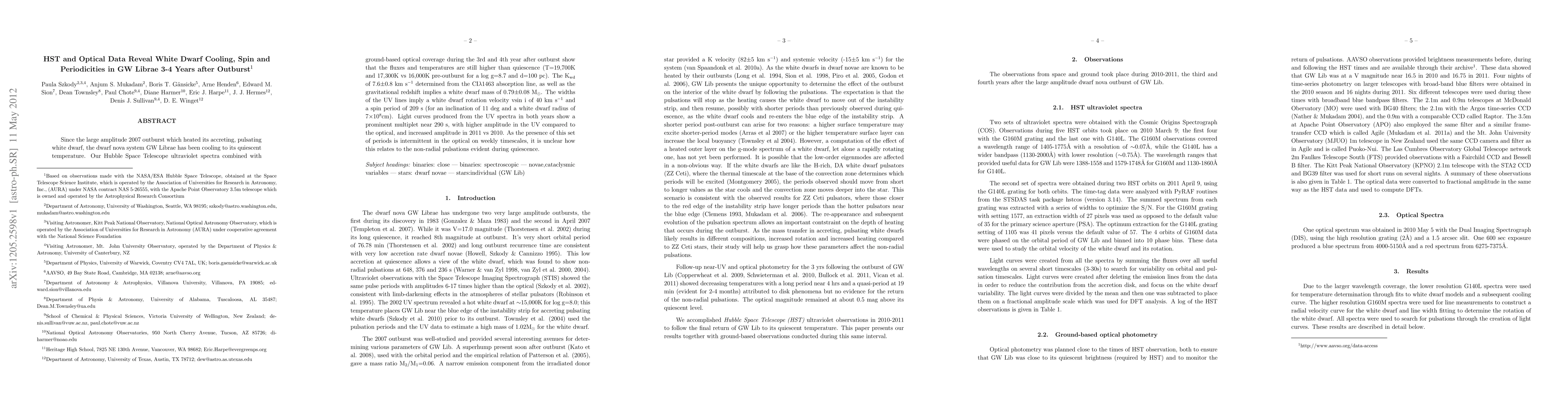 Since the large amplitude 2007 outburst which heated its accreting, pulsating white dwarf, the dwarf nova system GW Librae has been cooling to its quiescent temperature. Our Hubble Space Telescope ultraviolet spectra combined with ground-based optical coverage during the 3rd and 4th year after outburst show that the fluxes and temperatures are still higher than quiescence (T=19,700K and 17,300K vs 16,000K pre-outburst for a log g=8.7 and d=100 pc). The K{wd} of 7.6+/-0.8 km/s determined from the CI1463 absorption line, as well as the gravitational redshift implies a white dwarf mass of 0.79+/-0.08 Msun. The widths of the UV lines imply a white dwarf rotation velocity vsin i of 40 km/s and a spin period of 209 s (for an inclination of 11 deg and a white dwarf radius of 7x10^{8} cm). Light curves produced from the UV spectra in both years show a prominent multiplet near 290 s, with higher amplitude in the UV compared to the optical, and increased amplitude in 2011 vs 2010. As the presence of this set of periods is intermittent in the optical on weekly timescales, it is unclear how this relates to the non-radial pulsations evident during quiescence.