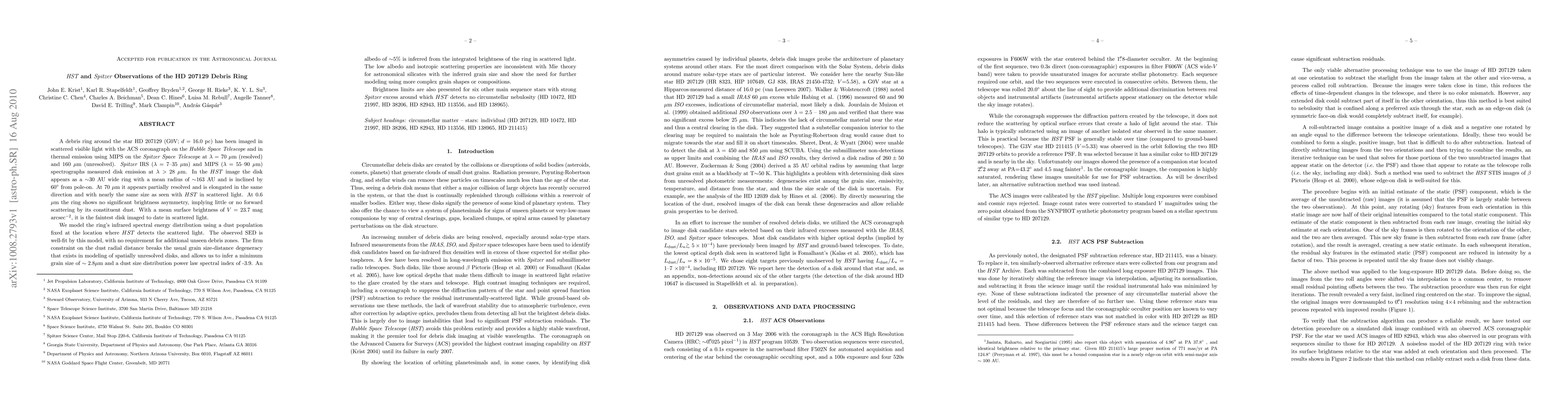 This paper presents observations of a debris ring around the star HD 207129 using the Hubble Space Telescope and Spitzer Space Telescope, revealing a faint, ~30 AU wide ring inclined at 60 degrees, with minimal brightness asymmetry and no significant forward scattering. The ring is partially resolved in thermal emission at 70 microns.