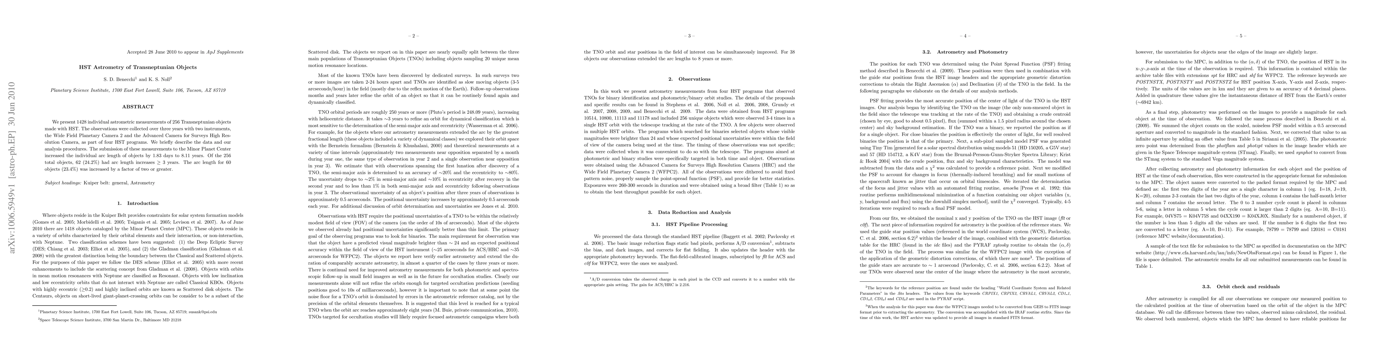 We present 1428 individual astrometric measurements of 256 Transneptunian objects made with HST. The observations were collected over three years with two instruments, the Wide Field Planetary Camera 2 and the Advanced Camera for Surveys High Resolution Camera, as part of four HST programs. We briefly describe the data and our analysis procedures. The submission of these measurements to the Minor Planet Center increased the individual arc length of objects by 1.83 days to 8.11 years. Of the 256 total objects, 62 (24.2%) had arc length increases \ge 3 years. The arc length for 60 objects (23.4%) was increased by a factor of two or greater.