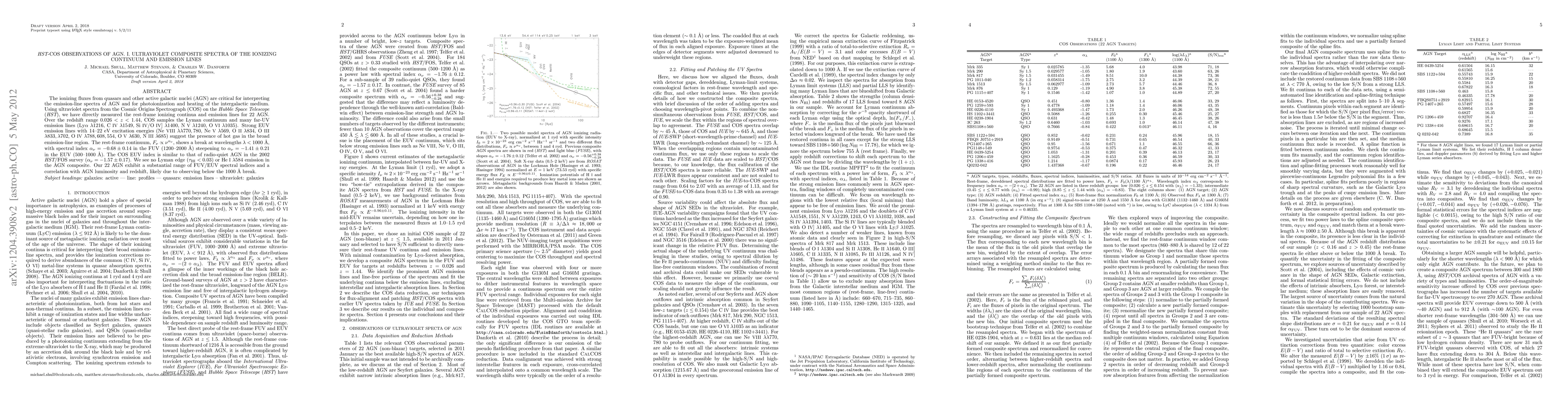 This study uses HST-COS data to measure the ultraviolet spectra of 22 AGN, revealing significant variations in their ionizing continua and emission lines across redshifts 0.026 < z < 1.44. The findings show a spectral index break at wavelengths below 1000 Å, with notable EUV emission lines indicating hot gas presence.