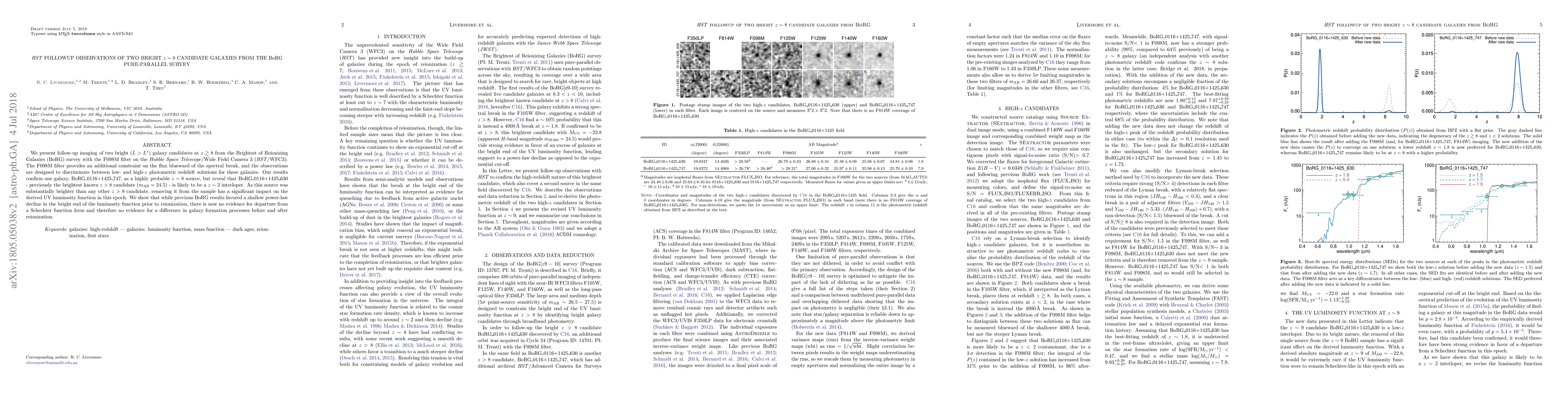 The research utilized HST/WFC3 F098M filter follow-up observations for two bright z ~ 8 galaxy candidates from the BoRG pure-parallel survey, aiming to discriminate between low- and high-z solutions.