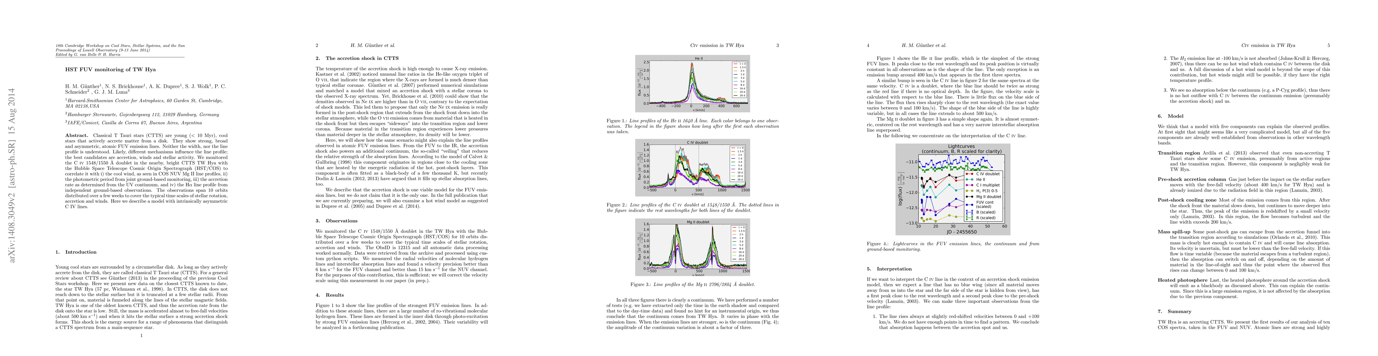 Classical T Tauri stars (CTTS) are young (< 10 Myr), cool stars that actively accrete matter from a disk. They show strong, broad and asymmetric, atomic FUV emission lines. Neither the width, nor the line profile is understood. Likely, different mechanisms influence the line profile; the best candidates are accretion, winds and stellar activity. We monitored the C IV 1548/1550 Ang doublet in the nearby, bright CTTS TW Hya with the Hubble Space Telescope Cosmic Origin Spectrograph (HST/COS) to correlate it with i) the cool wind, as seen in COS NUV Mg II line profiles, ii) the photometric period from joint ground-based monitoring, iii) the accretion rate as determined from the UV continuum, and iv) the Ha line profile from independent ground-based observations. The observations span 10 orbits distributed over a few weeks to cover the typical time scales of stellar rotation, accretion and winds. Here we describe a model with intrinsically asymmetric C IV lines.