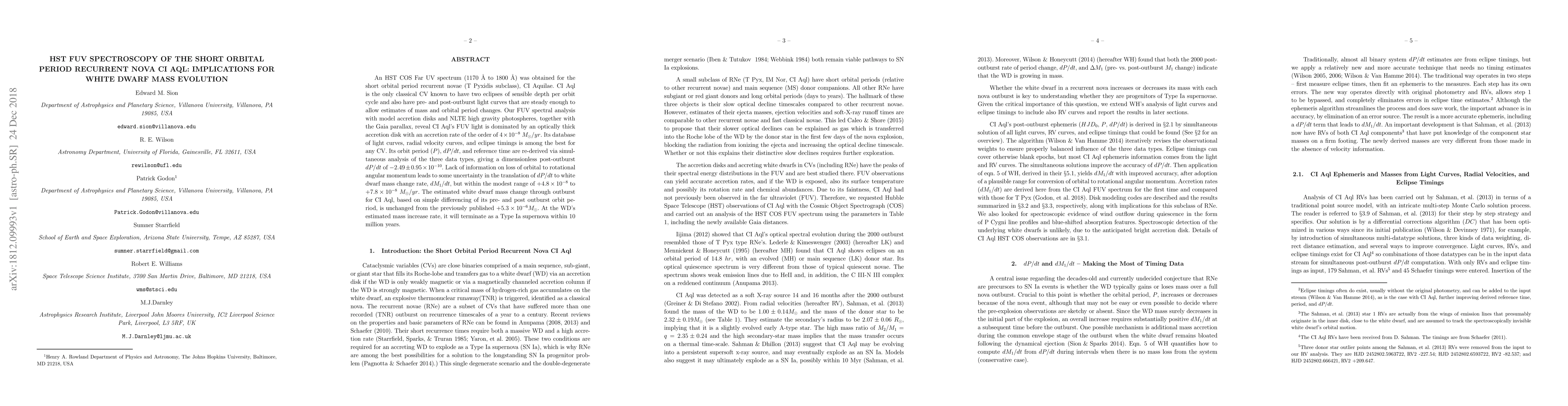 An HST COS Far UV spectrum (1170 A to 1800 A) was obtained for the short orbital period recurrent novae (T Pyxidis subclass), CI Aquilae. CI Aql is the only classical CV known to have two eclipses of sensible depth per orbit cycle and also have pre- and post-outburst light curves that are steady enough to allow estimates of mass and orbital period changes. Our FUV spectral analysis with model accretion disks and NLTE high gravity photospheres, together with the Gaia parallax, reveal CI Aql's FUV light is dominated by an optically thick accretion disk with an accretion rate of the order of $4\times 10^{-8}$ $M_{\odot}/yr$. Its database of light curves, radial velocity curves, and eclipse timings is among the best for any CV. Its orbit period ($P$), $dP/dt$, and reference time are re-derived via simultaneous analysis of the three data types, giving a dimensionless post-outburst $dP/dt$ of $-2.49\pm 0.95\times 10^{-10}$. Lack of information on loss of orbital to rotational angular momentum leads to some uncertainty in the translation of $dP/dt$ to white dwarf mass change rate, $dM_1/dt$, but within the modest range of $+4.8\times 10^{-8}$ to $+7.8\times 10^{-8}$ $M_{\odot} /yr$. The estimated white dwarf mass change through outburst for CI Aql, based on simple differencing of its pre- and post outburst orbit period, is unchanged from the previously published $+5.3 \times 10^{-6} M_{\odot}$. At the WD's estimated mass increase rate, it will terminate as a Type Ia supernova within 10 million years.